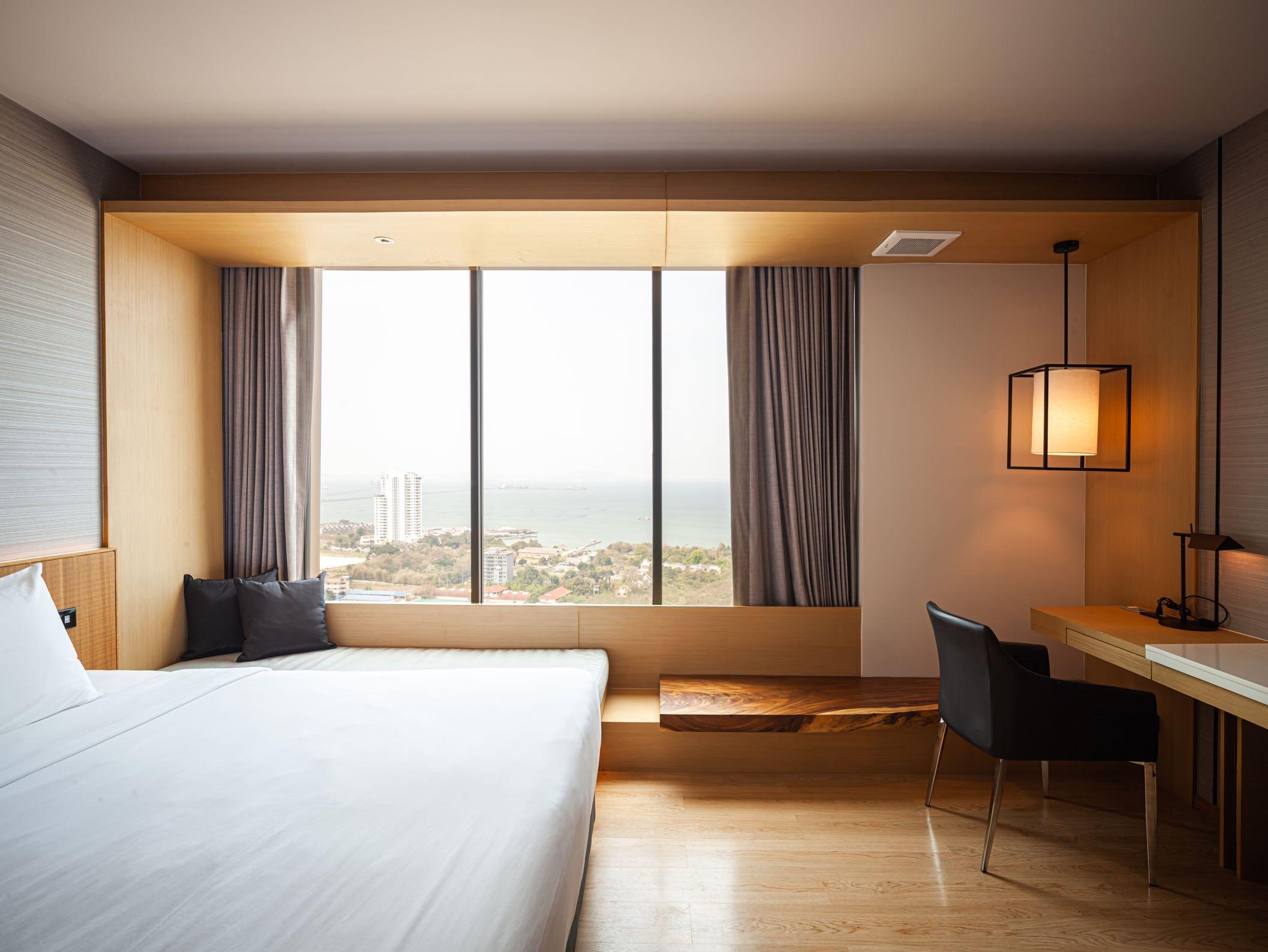 The hotel consists of 379 guestrooms, most of which are long-stay guests The project's owners intended to apply a double-loadcorridor system in the guestroom zone to minimize the circulation area in the tower design. In doing so, the designers developed an option that allowed all rooms to see the beautiful view, by having one side of the building facing the gulf of Thailand and the other facing mountain view. Many common areas are filled in every floor and flexible for any outdoor activity. They continually connect to the top level on which the penthouse is placed - a combination of living area, bedrooms, and meeting room for the owners.