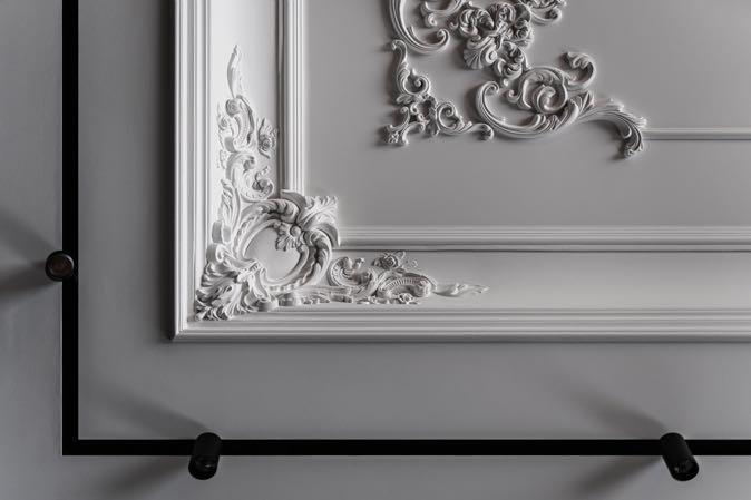 One of the Empire style elements, molding in the form of a pattern on the ceiling, gives an antique tone to the space, blandly formed as a result of natural match and placement of modern furniture from Italian brands