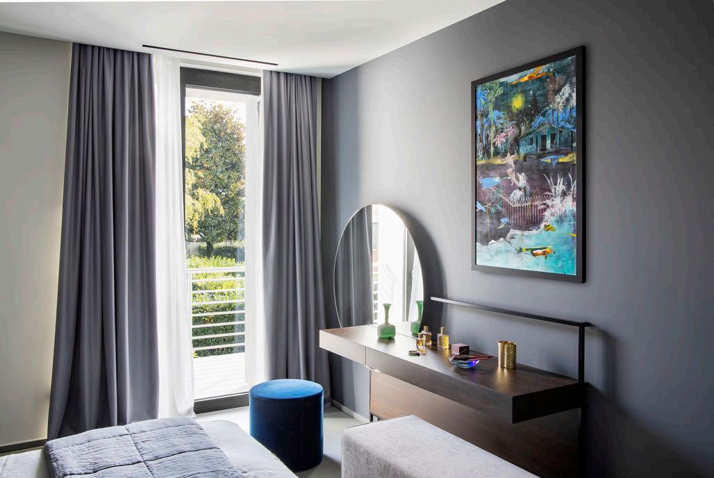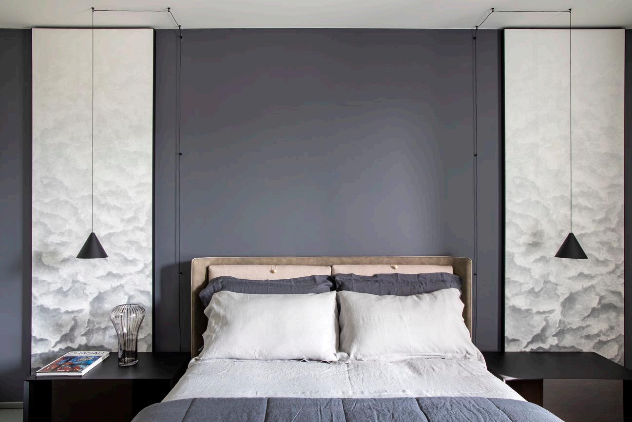 The main bedroom is equipped with a retractable walkin closet and bathroom, here, it's noted the presence of a more custom designed furniture, such as bedside tables and the console / beauty. While a delicate wallpaper with a romantic design frames the suspended lighting elements.