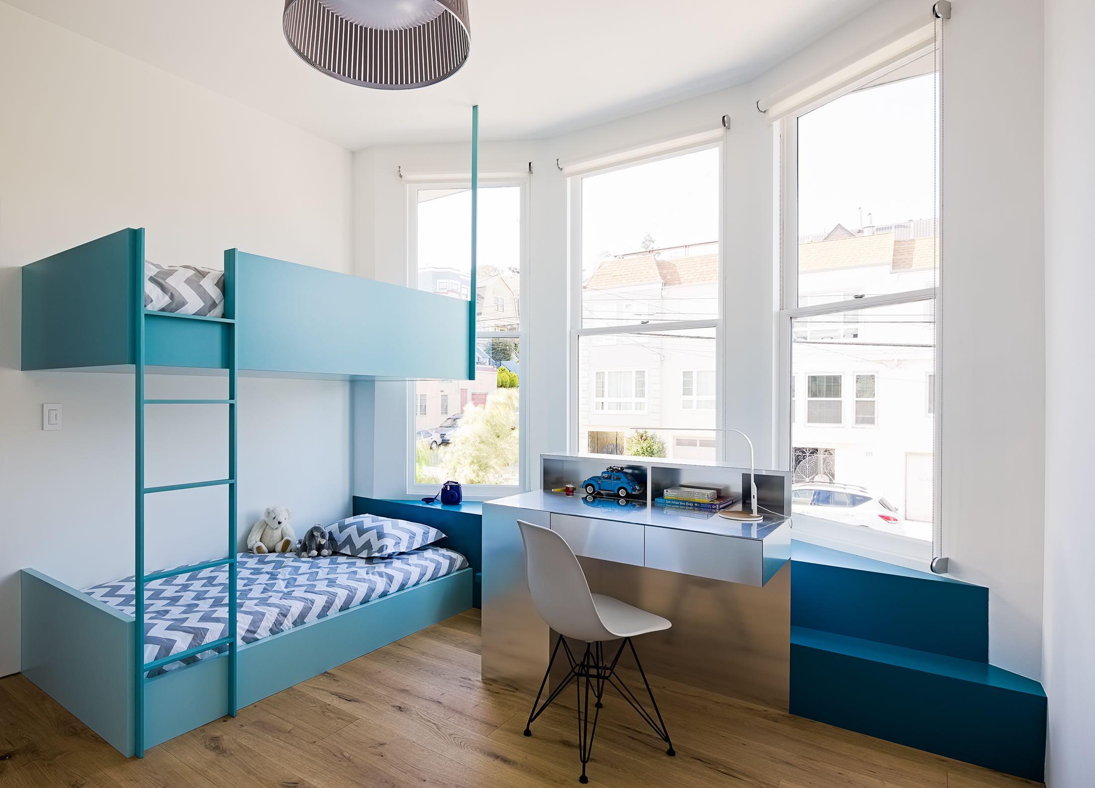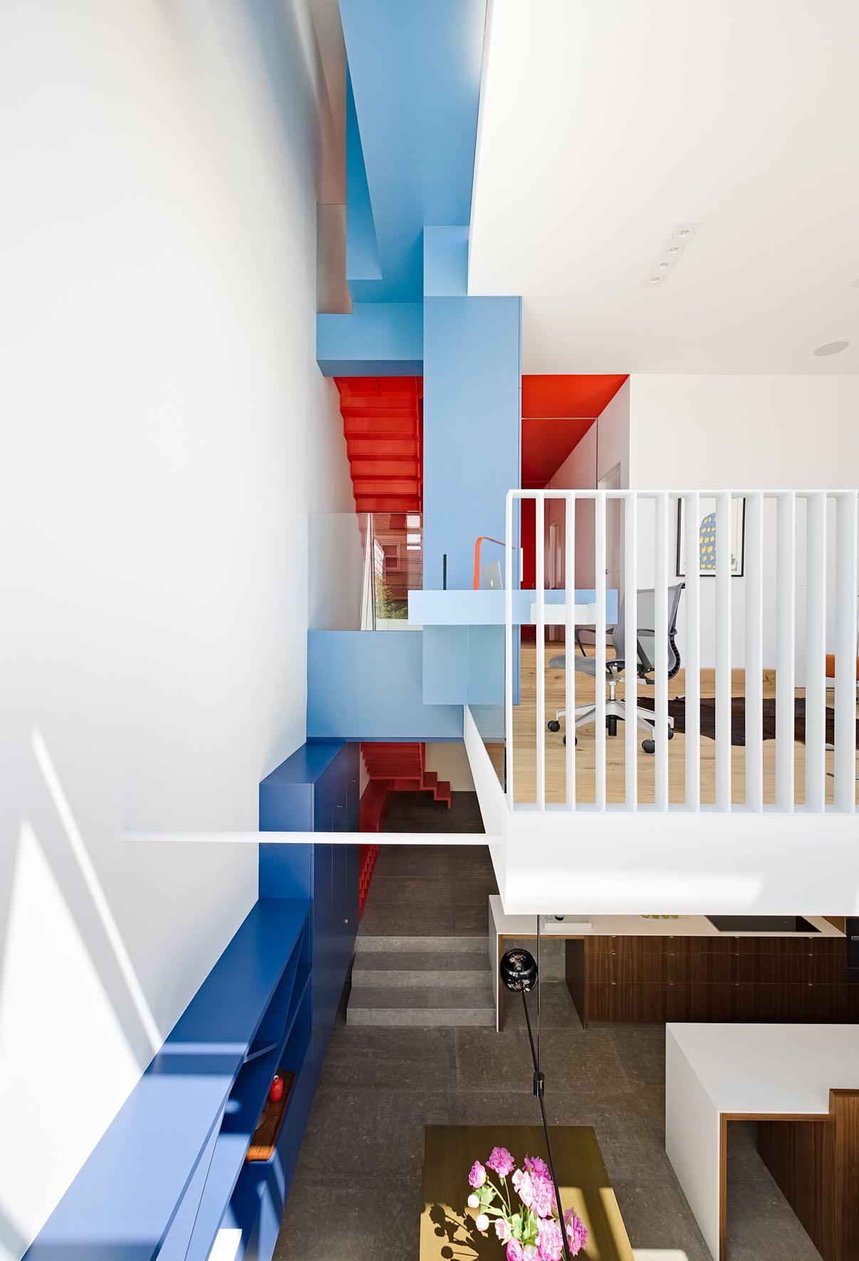 Placed in one of the slots, the bright orange stairs are used as a dynamic organizing element. The perforated metal rail folds in and out recalling the exterior façade. Color and material were used to enliven the interiors. All cabinetry within the slot is all painted various shades of blue from light to dark, emphasizing the progression from top to bottom.