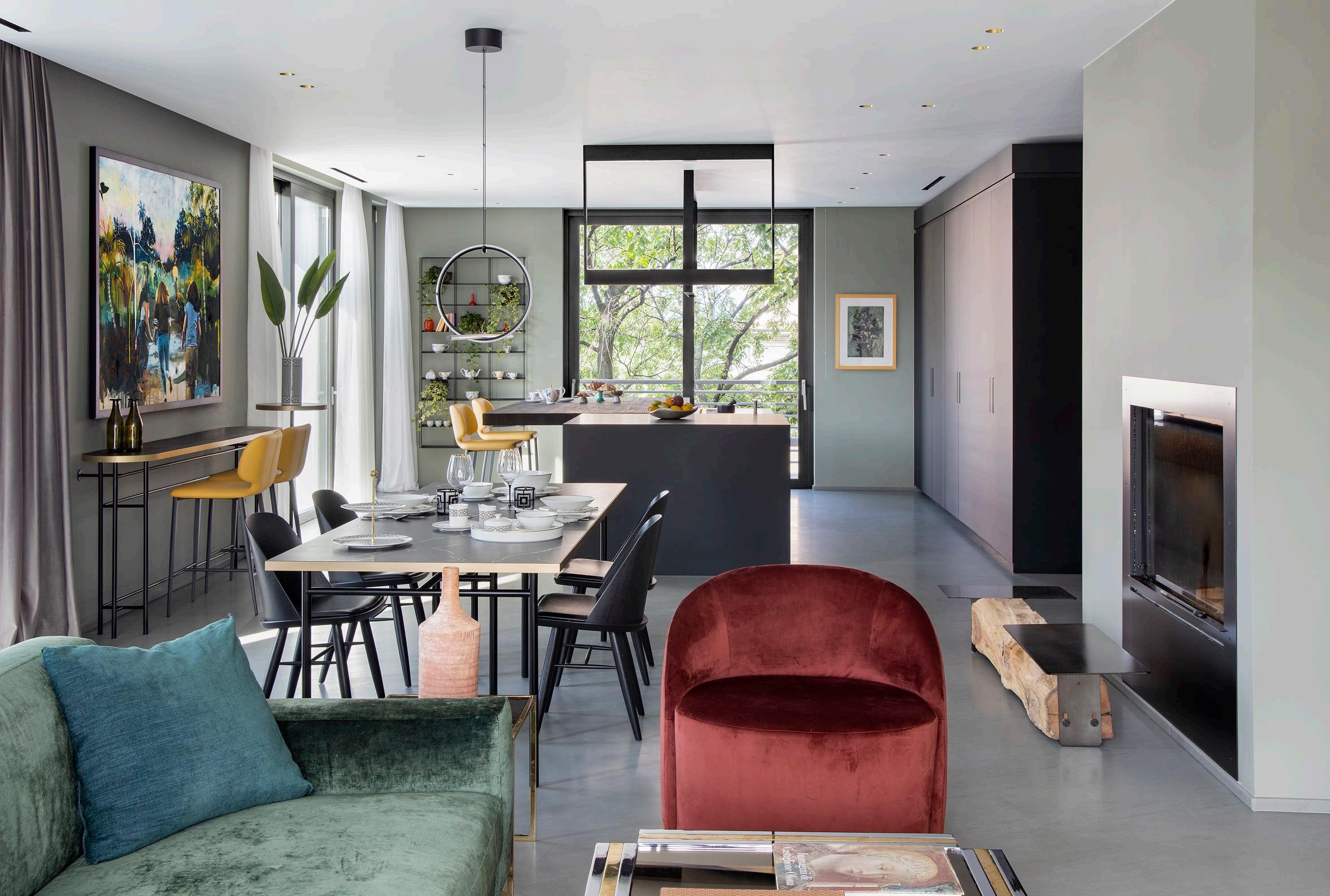 In the living area, the presence of warm velvet dominates. Here, in the abundant open space we find three distinct areas: the sofa area, the table area and, finally, the one dedicated to the kitchen Overall, modern and rational geometries embrace the soft and elegant velvet, allowing the exaltation of natural colors and the clearest distinction of every detail from its own context.