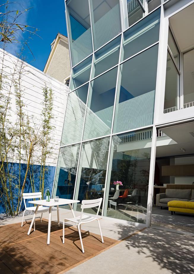 In order to maximize the small footprint of the house, the ground floor was excavated at the rear extension. The back façade, which is tilted at 9 degrees, is built of a custom fieldglazed steel frame with insulated glass. The angle over two stories–a canted facade–maximizes space and square footage in the house