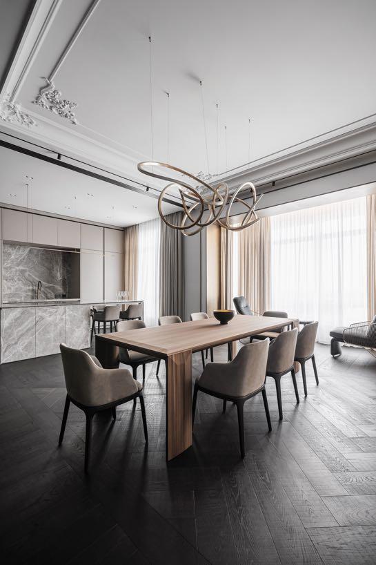 The entrance room of the apartments gives into a spacious area of the combined living, dining and kitchen From the entrance it sets the necessary element of the concept and breaks down trivial trends in interior design the custom-made floor covering was assembled in a certain unique pattern from versatile stone and brass tiles.