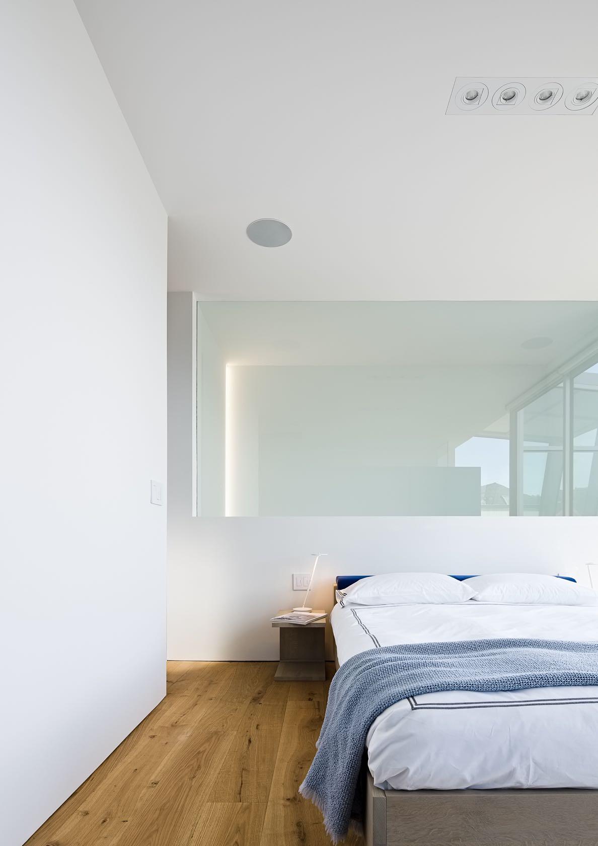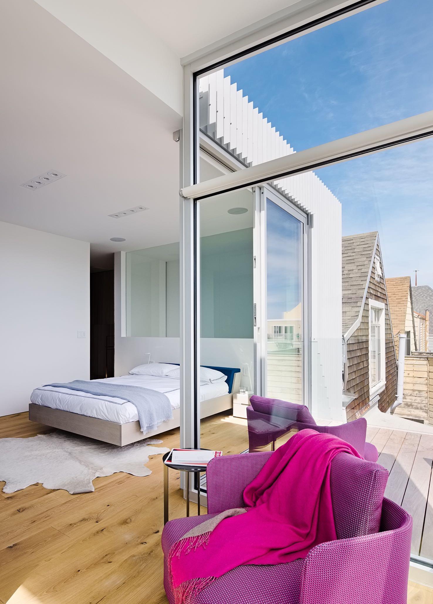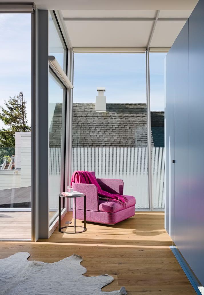 At the top floor, the master bedroom windows, and deck are oriented towards distant views of the San Francisco Hills ensuring both a wonderful view and natural light. As in the rest of the house, the design is simple and minimalist, but the room is characterized by the presence of pink armchairs which together with the wood create a warm atmosphere. Separated by a wall, the bathroom in wood has a glamorous touch thanks to the pouf, also pink .