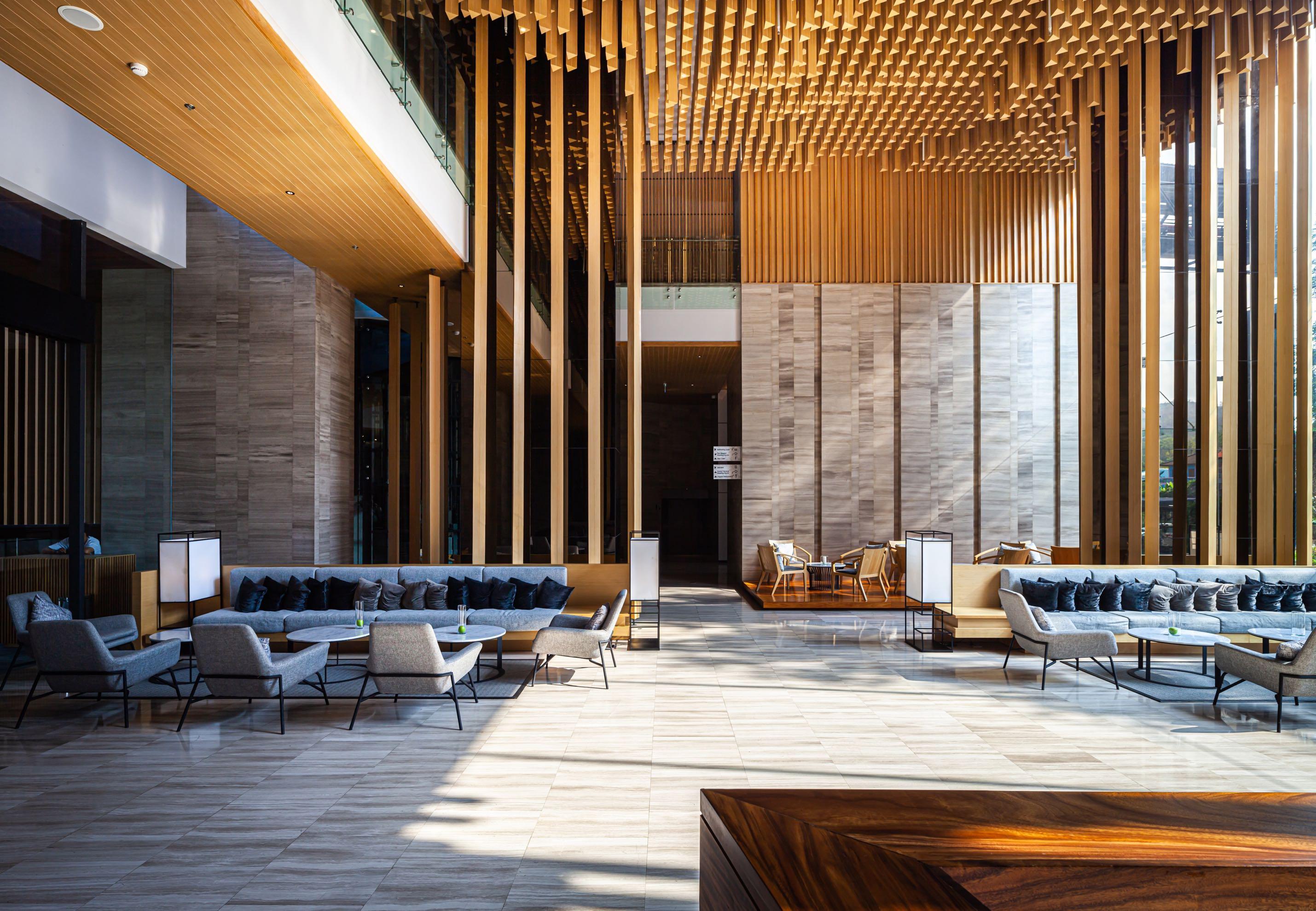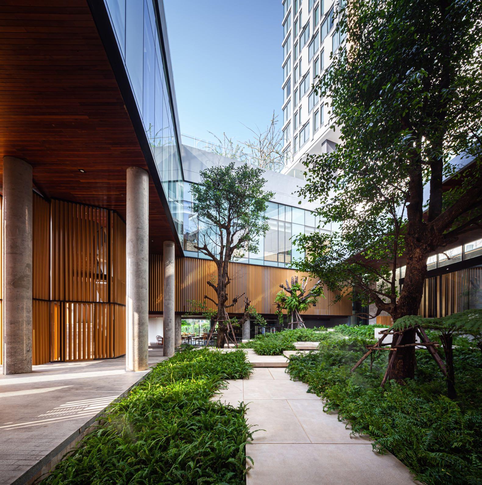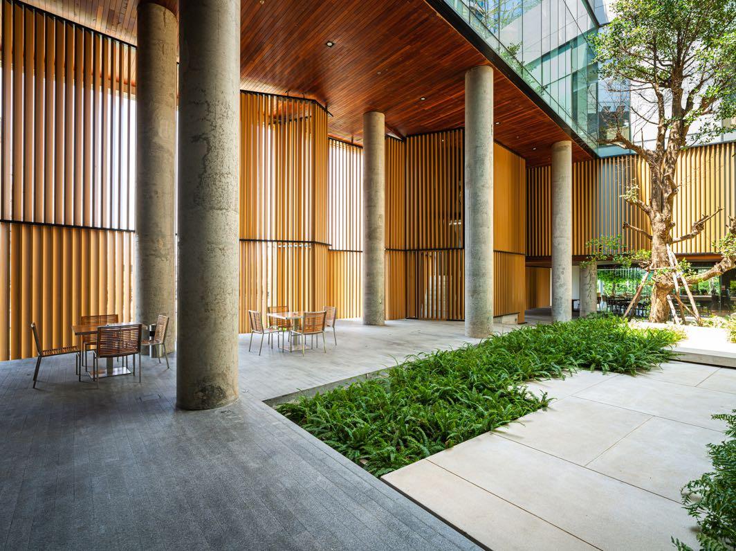 At the podium zone, a massive enclosed courtyard keeps most existing trees and acts as a serene welcome area for guests; it protects the area from chaos in its neighborhood This court is inspired by the concept of "Engawa," which means a terrace connecting people and nature. Laths are selected as a feature element to enclose the courtyard and control the quality of light shining into space. The light and shade change over time. This occurrence reflects the origin of the Japanese word "Ma," which means "Space" or "Place" in Japanese architecture. It is derived from the word "Door" and "Sun," which implies that sunlight seeps through the door's void.