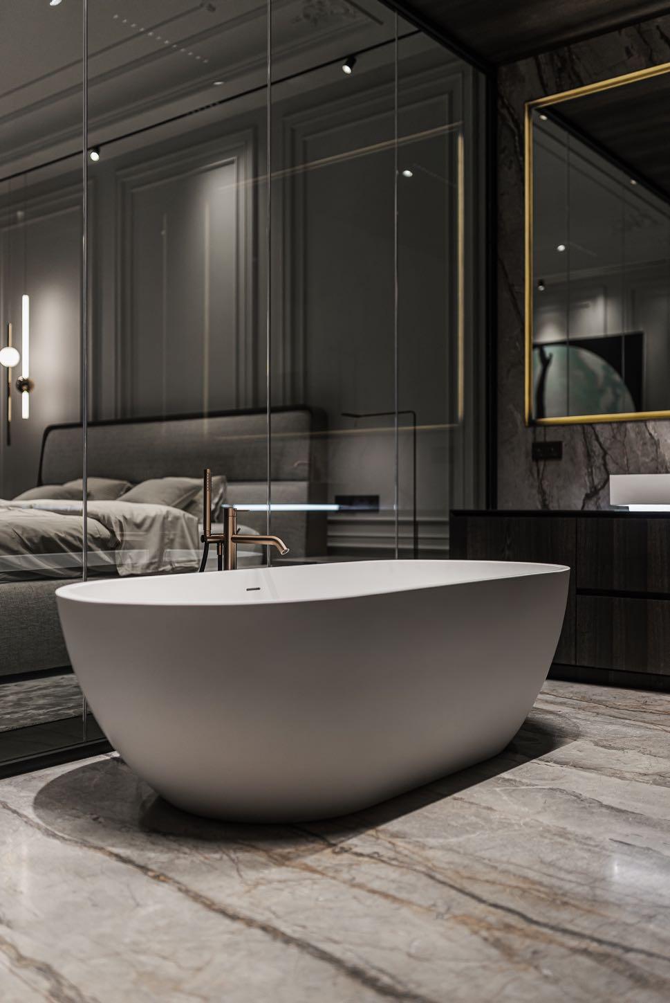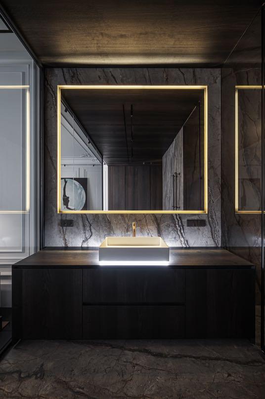 open a mesmerizing view of the Motherland Monument, one of the highest monuments in Europe. The client is a young man of sophisticated taste, a person with his own understanding of aesthetics, collector enamored with Ukrainian Art. So, design concept of the apartment combines nude shades with glass partitions made of graphite glass, natural stone with brass, and custom elements, developed in only one copy. Thus, every element creates a unique understanding of modern living by the YODEZEEN team