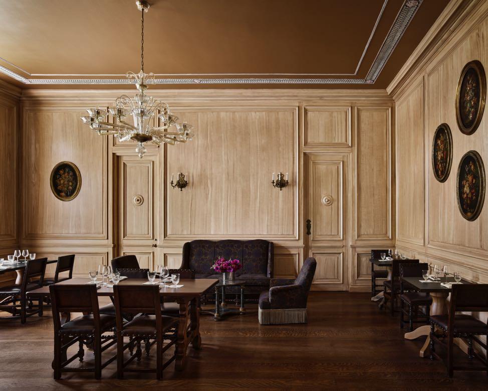 Downstairs, the entrance leads to the main hall with a loggia, terrace and the gardens beyond, which serve collectively as a lobby and gathering space. Other rooms downstairs in the mansion function as they historically would have: The Living Room is furnished with a new service bar and deep Chesterfield sofas for gathering fireside with a cocktail; The oval book-lined Library is set up for reading or quiet conversation with overstuffed chairs and a game table; the sunny Solarium, with its original tile floors, is perfect for small bites or cocktails.