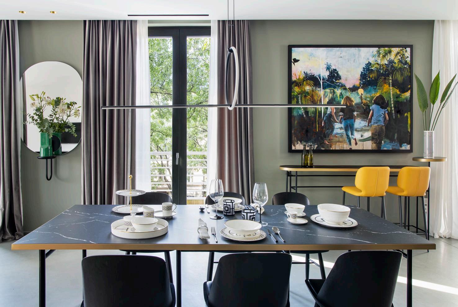 The major accent in the dining area is taken by the custom-made brass lamp above the dining table — created by Cameron Design. The specific element of the apartment concept is about the art of Ukrainian artists and sculptors Paintings by Viktor Sydorenko and sculptures by Nazar Bilyk complement the interior with the necessary element of authenticity.