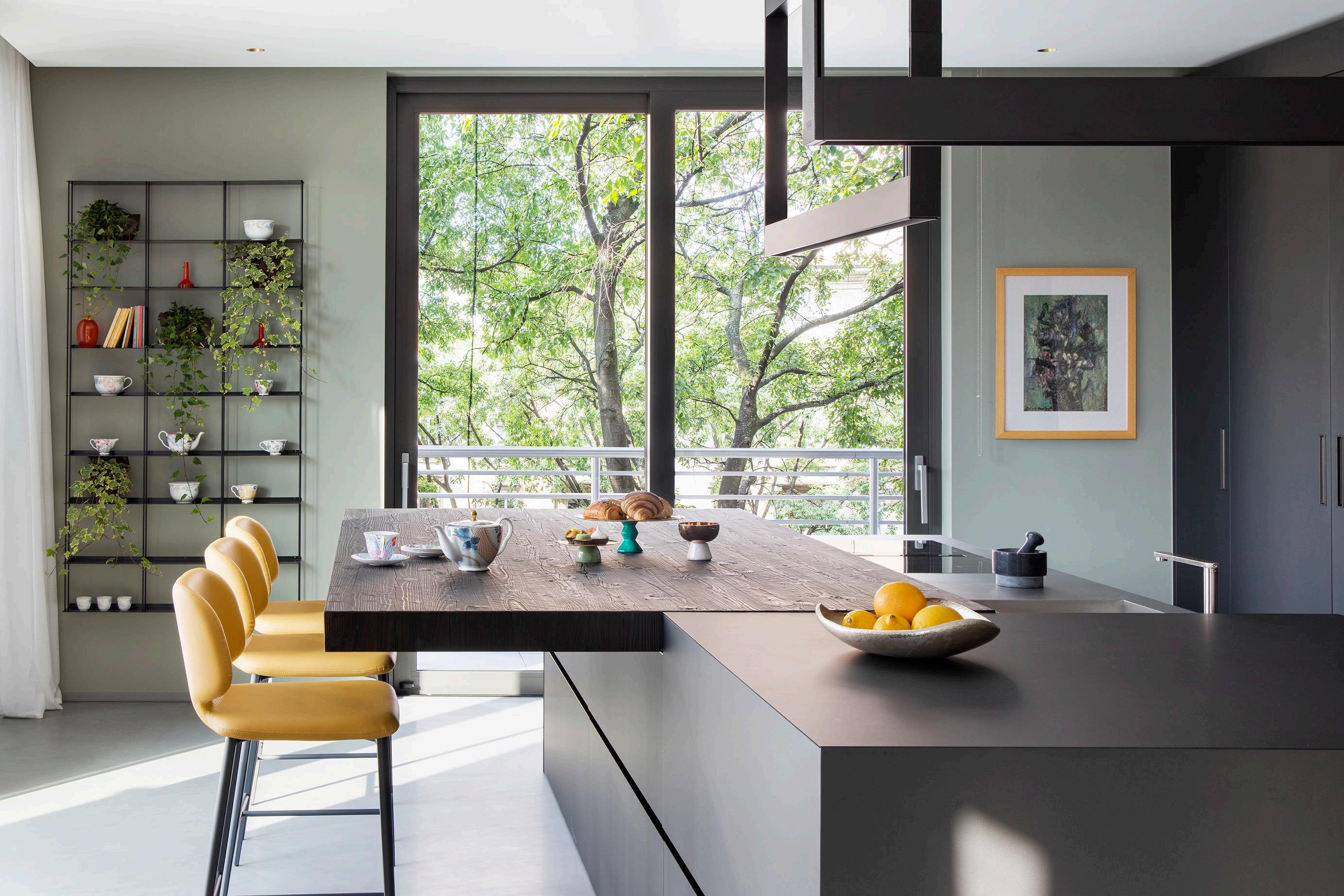 The living area triptych is closed by the kitchen made up of a concealed monobloc with retractable doors, to which an abundant island hosting sink and induction hob with a sliding top in natural smoked oak is added with exquisite opportunity Present also a series of comfortable stools dedicated to the “snack area”.