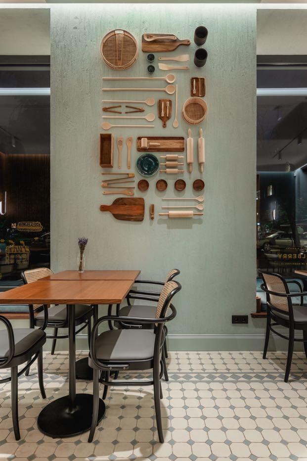BY OPEN AD OPEN AD introduced 21st century interpretations of the wall panelling and cornices which had disappeared from the ground floor space. The furniture is a modern take on classic pieces. The designers embraced rich materials like velvet, marble, brass and wood. The flowing shapes of the furniture are a nod to Art Nouveau. A handmade wall decor honors the craftsmanship and skill of the pastry chefs. The collage is made of sieves, spoons and spatulas. It references just how much work and attention goes into every pastry. This incredible attention to detail was also a guiding principle for Open AD in the overall design of the Mulberry. Address: Ausekļa iela 14 –Riga, Latvia