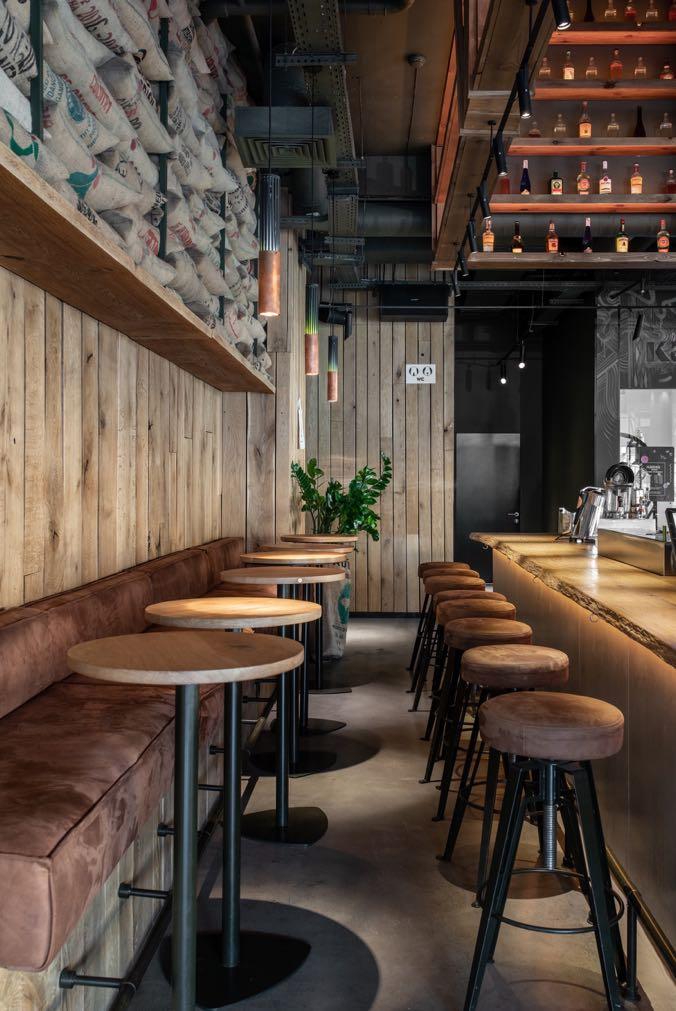 BY YOD GROUP The interior, décor details and menu are tied around the coffee theme. The cafe space is decorated in the typical style of American cafe: graphite-pastel colors, laconic handmade furniture, decoration of natural materials - wood, concrete, metal, leather. The centerpiece of the interior is a bar counter, where in the evening the author's coffee cocktails are prepared. One has only to go to the bar area, as before the eyes there is a spectacular view of shelving with alcohol, which have no end - thanks to the darkened mirror on the ceiling, their magnitude is emphasized. Address: AntonovychaSt 172, 03150 -Kyiv, Ukraine