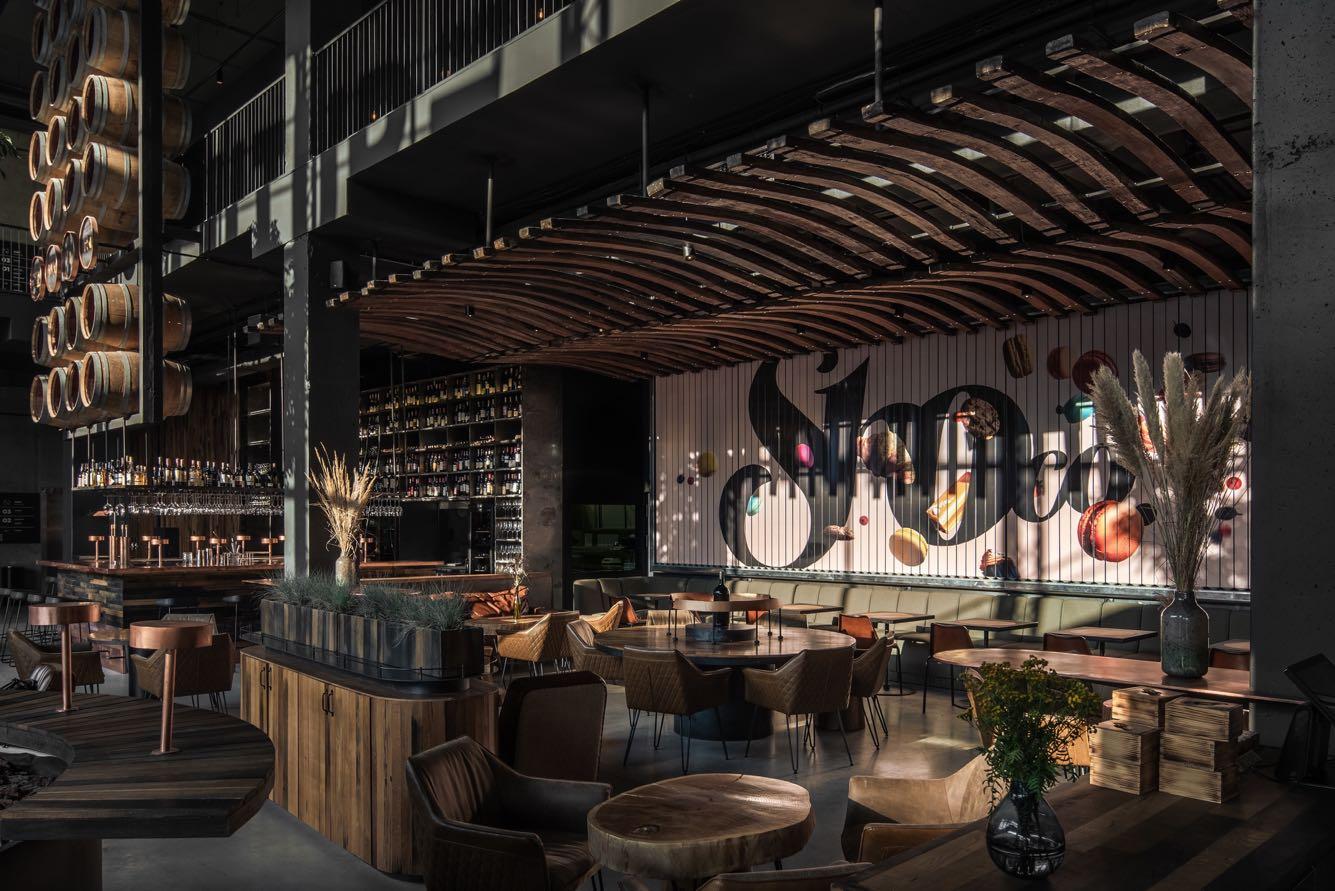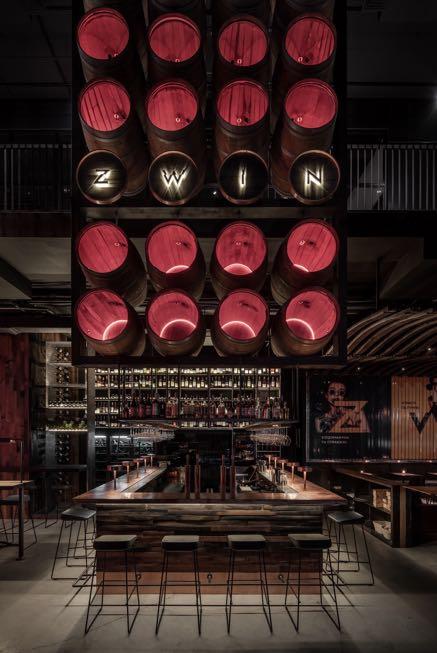 BY YOD GROUP ZWIN & SHOco. combines a modern confectionerybakery and wine bar. The uniqueness of this project lies in the combination of two different formats within the same space, which work with different products independently of each other. In the design of this project used authentic materials: all wooden furniture and installations are made of oak wine barrels. Bar counter and high tabletops lined with copper. In the center of space above the bar counter is installed a large-scale installation of 32 Bordeaux barrels with the ZWIN logo. Thanks to backlighting, it attracts people's attention from the street – in the evening it is clearly visible through the front panoramic windows. Address: KulparkivskaSt 200A, 79071 - Lviv, Ukraine