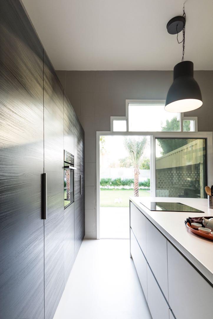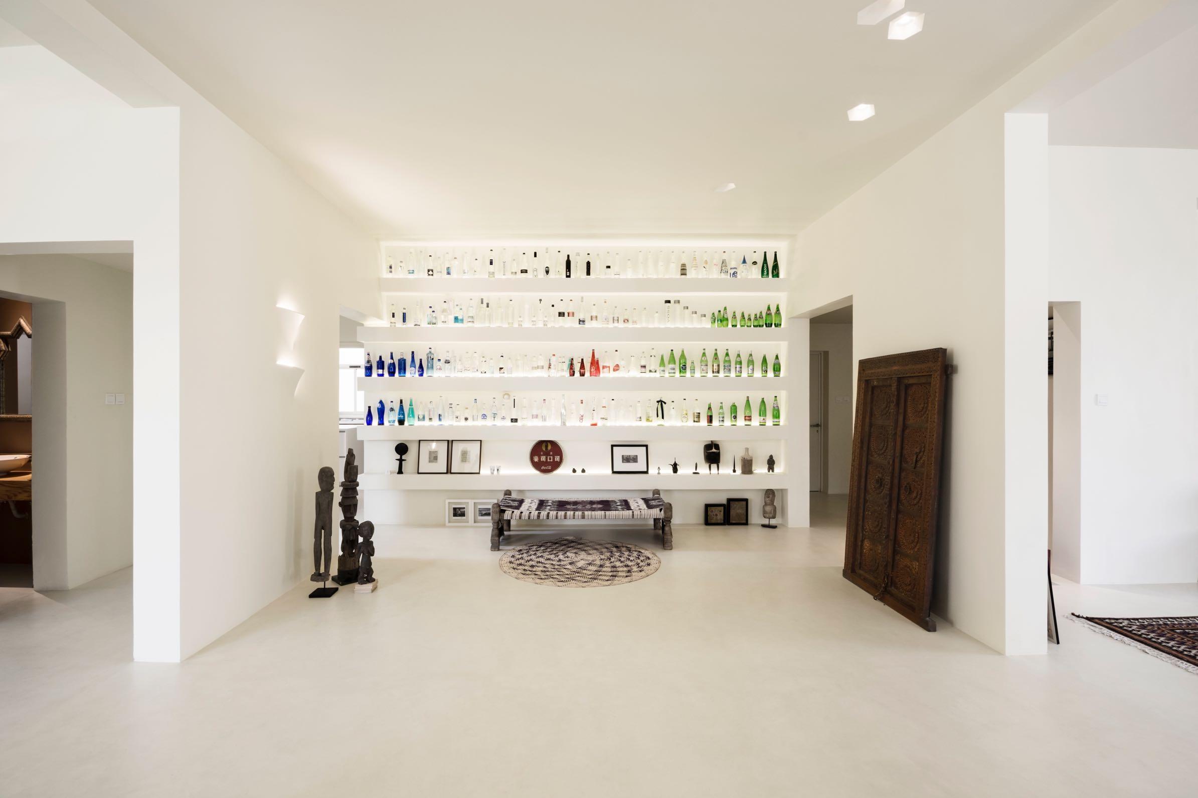 Fixed furniture was used to show continuity and seamless transition from the wall surface to utility shelves and the same approach was adopted for recessed light fixtures as well.