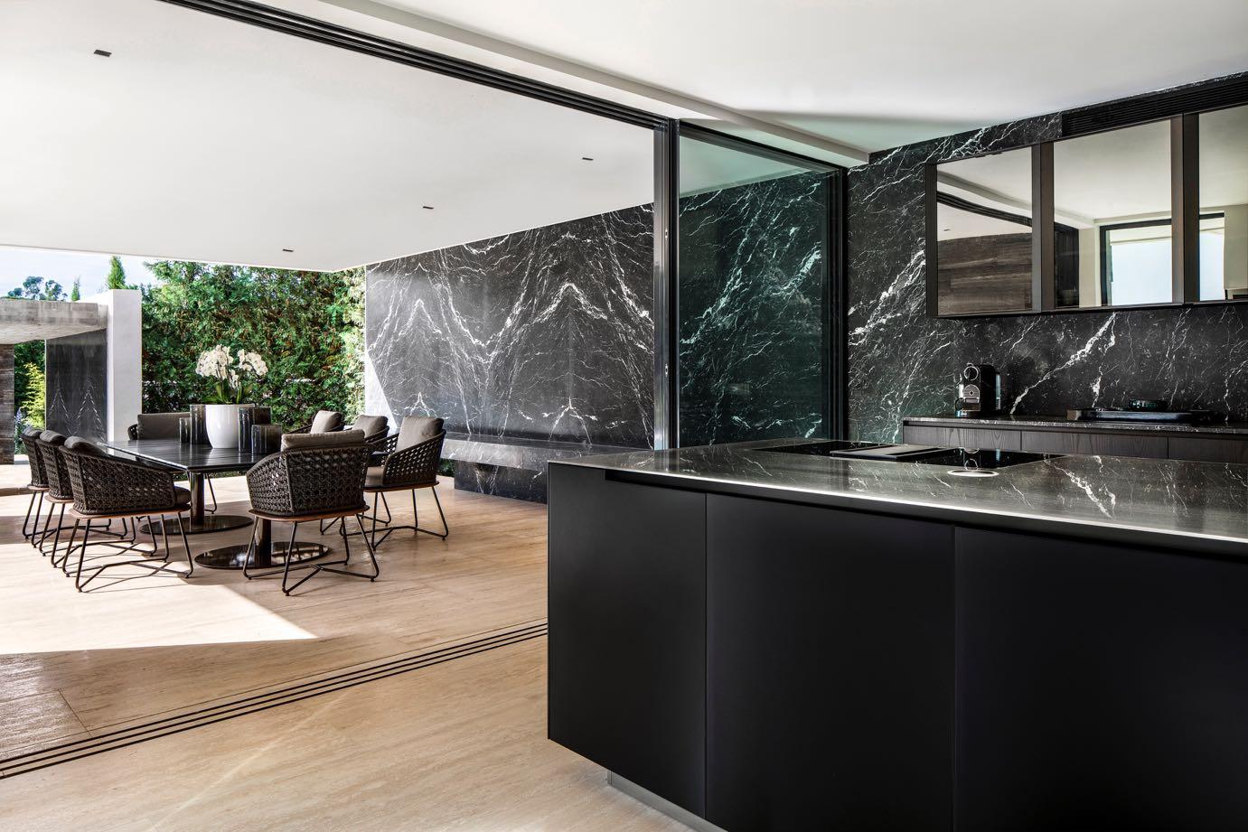 The interior finishes contrast raw, expressive concrete on the soffit, for example, with dark marble cladding on the rear walls, lighter stone towards the front of the house and vein-cut travertine floors The natural materiality emphasises the architecture as an extension of the landscape, while the dark stone towards the back of the living area accentuates the illusion of depth, further enhancing the sense of space