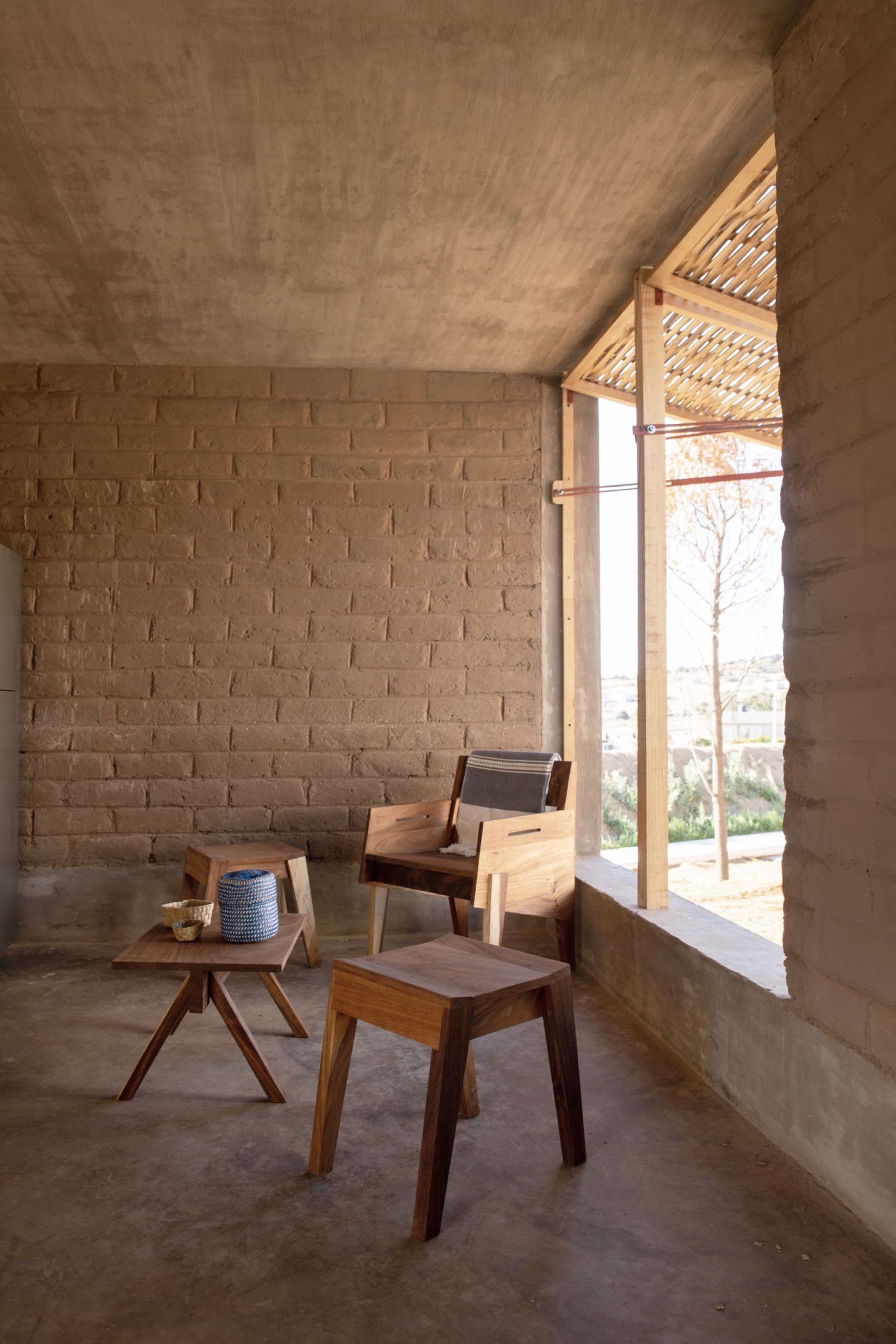 The concrete frame structure of the house is resistant against earthquakes. Adobe blocks that were manufactured on site by locals form the solid walls as infills to the concrete framework.