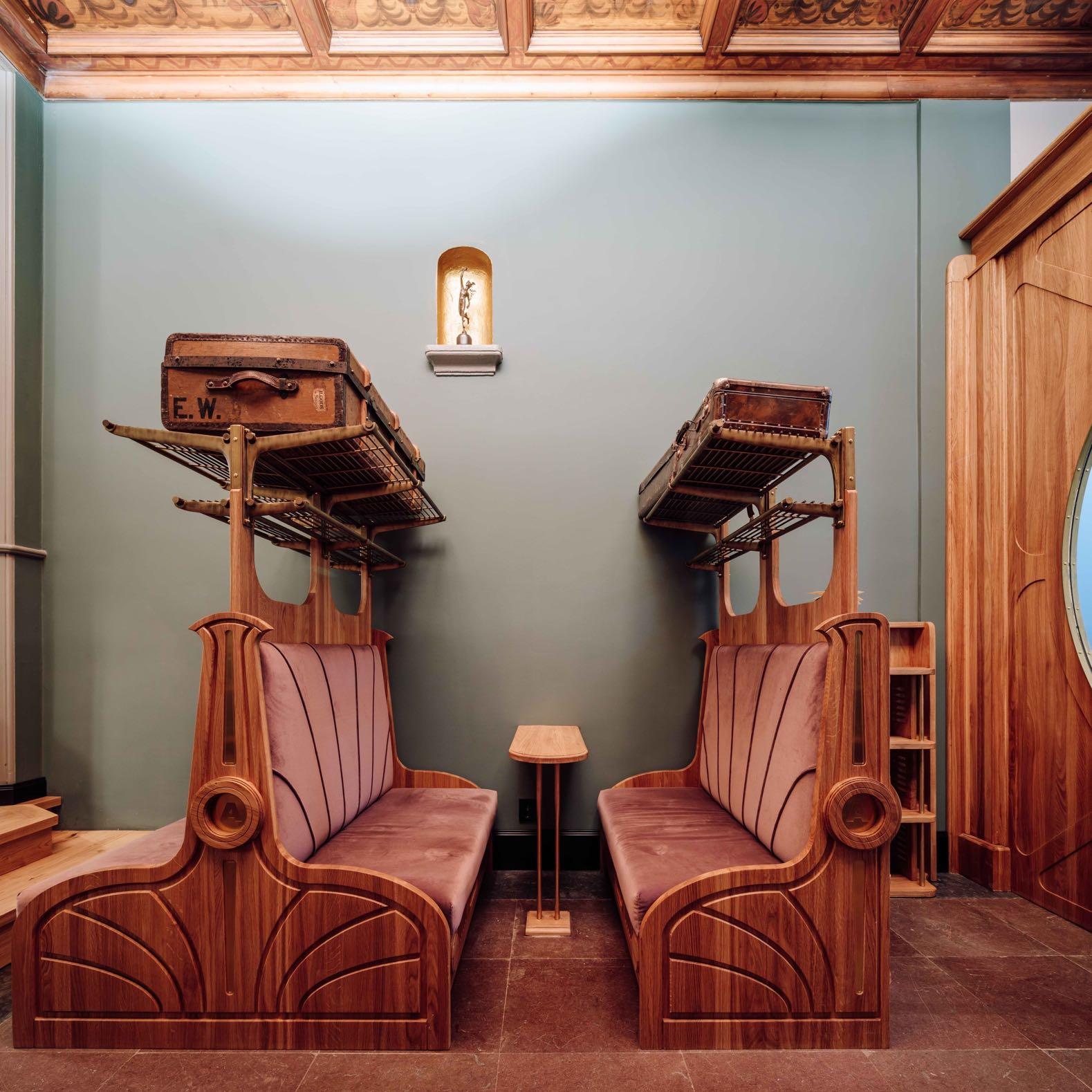 Helsinki-based studio, Puroplan has smartly created a sense of space by separating the bathroom with a decorative white opaque glass panel and adding a smoked-glass mirrored wall behind the bed. These details also create a modern canvas for the collection of framed maps, photographs and old dining menus from the ships – uncovered during the building process – and for the furnishings, most of which are reproductions of original mid-century classic, like Veng, an armchair designed by Torbjørn Bekken in 1960; Briger Dahl’s Birdie table lamp (1952); and pendant lamps by age-old Norwegian glassblowing company, Hadeland, who also provided the ship’s original glassware.