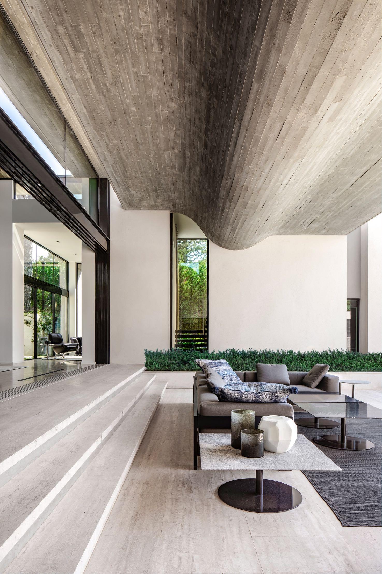 the central high-volumed void between the wings, capped with a dramatically folded floating roof, which imparts a sense of grandeur to the interiors The folded shape of the roof, formed using raw wooded planks in a subtle reference to the pines, not only echoes the cascading terraces of the landscape but also contrasts with the straight-lined geometry of the wings on either side. SAOTA Director Phillippe Fouché, lead architect on the project, said that the fold in the roof plays a structural role too, enabling a 12-meter span without any columns. Positioning the house towards the back of the site created the opportunity for the living spaces to step down with the terraced landscape, seamlessly extending the useable space. SAOTA’s approach explored various strategies to maximise the perception of space, such as cavity doors to blur the distinction between interior and exterior spaces and allow the cool summer breezes to flow through the house.