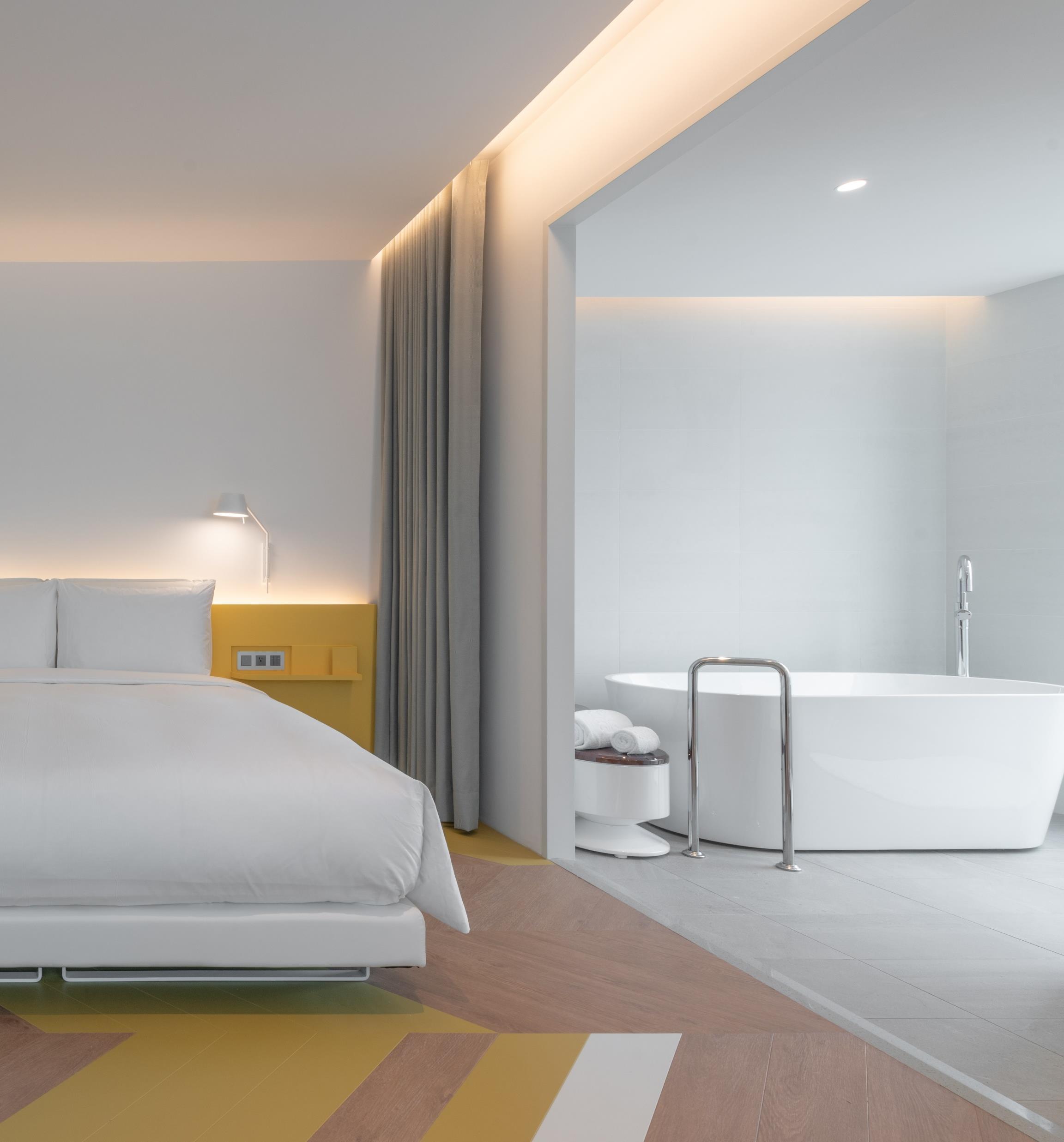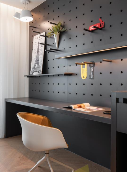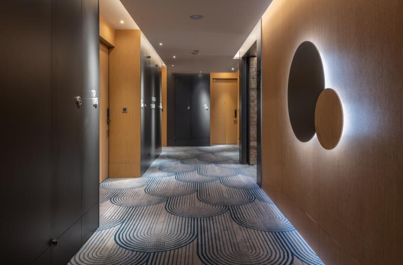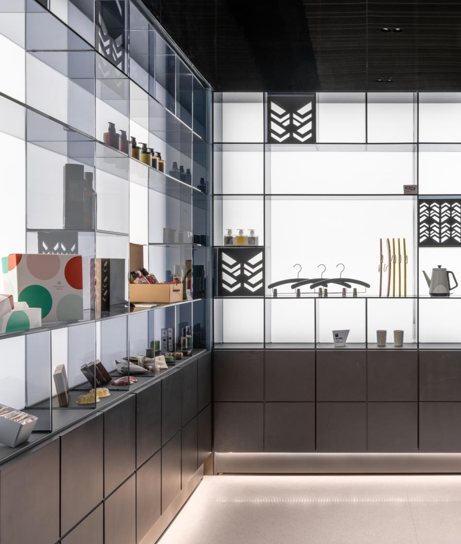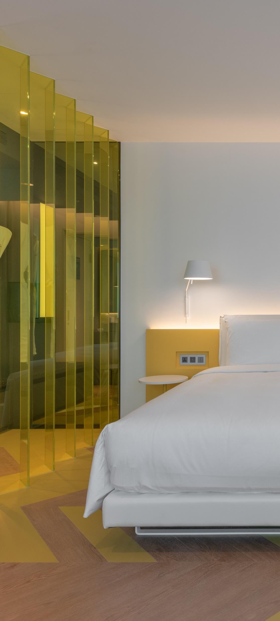 While the lobby is a tea house, the hotel corridors and rooms embody the tea production process. The corridor carpet pattern evokes the terraced tea plantation landscape. Stepping into the rooms, the chevron wood floor pattern echoes the woven bamboo baskets for drying tea leaves. The colour palette is natural wood with Pouchong tea-coloured accents. In total, the hotel includes 179 compact guestrooms that vary between 20 m2 and 43 m2. The Place is primarily a business hotel, with guests coming for trade fairs and shows. Storage space and computer working stations are therefore conveniently provided. There are seven types of rooms, each with a compact layout and designed to appear as spacious as possible.