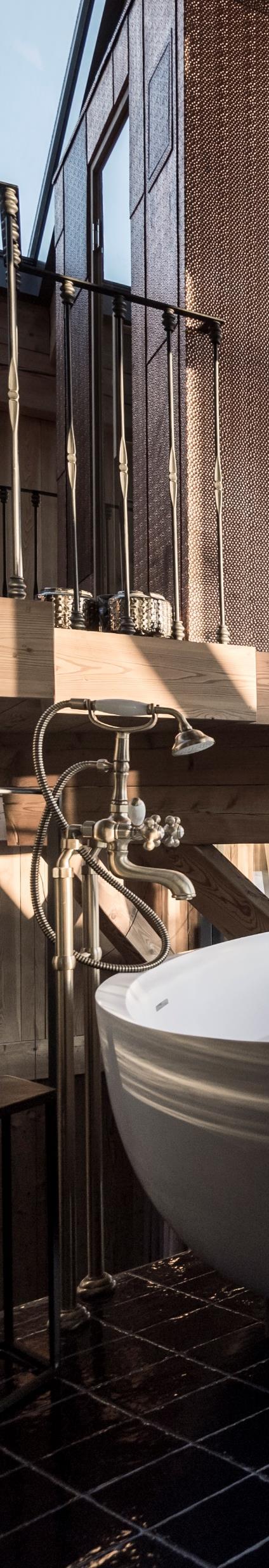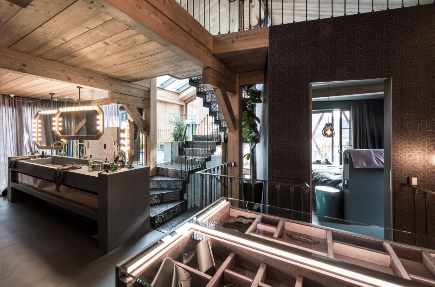 The staircase, in finely worked steel recalls the grates of Arabian tradition, creating a chiaroscuro effect which is extremely unusual for the Alpine environment.