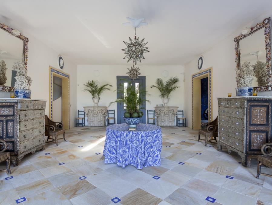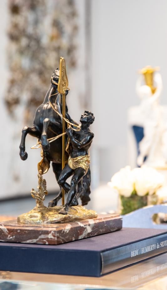 For the living room the designer has chosen the Boca Do Lobo Versailles sofa: this creative piece made in a wood structure and panels in a manual sculpture, enriches the decoration of the space and, with its blue color, contributes to the balance of colors giving a remarkable contrast.