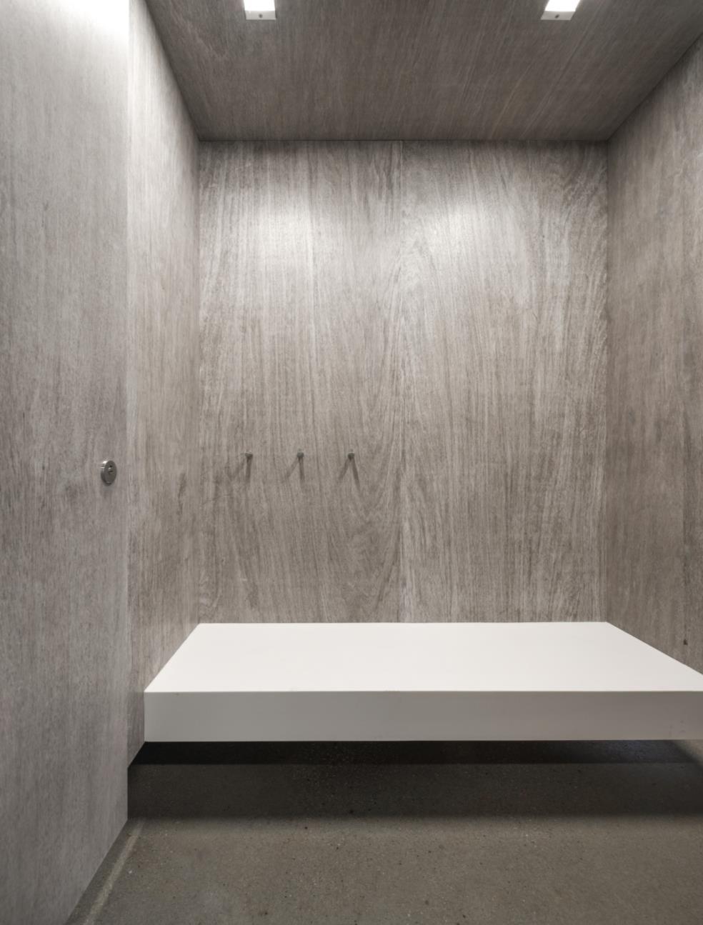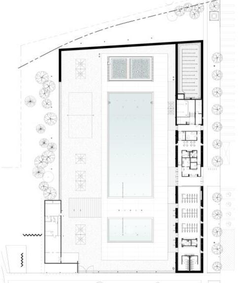 filtration process. The architects began by establishing a pool technology that cleanses the water through stone, gravel, sand, and botanic filtering processes, and this inspired them to create a materials-oriented concept for the changeroom facility that achieves a technically rigorous and aesthetically integrated design.
