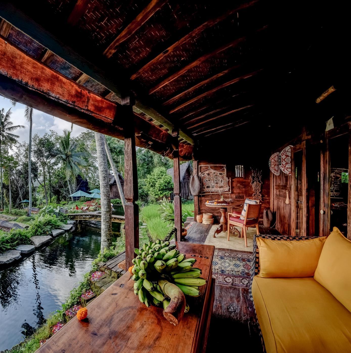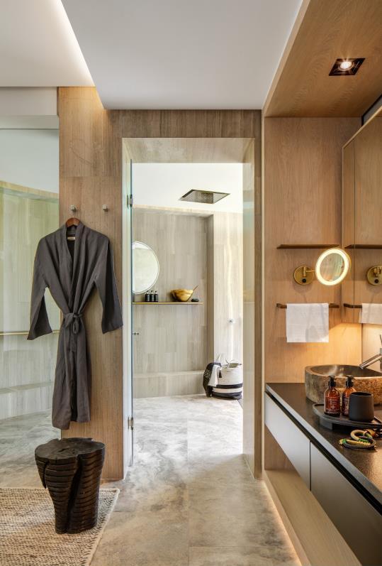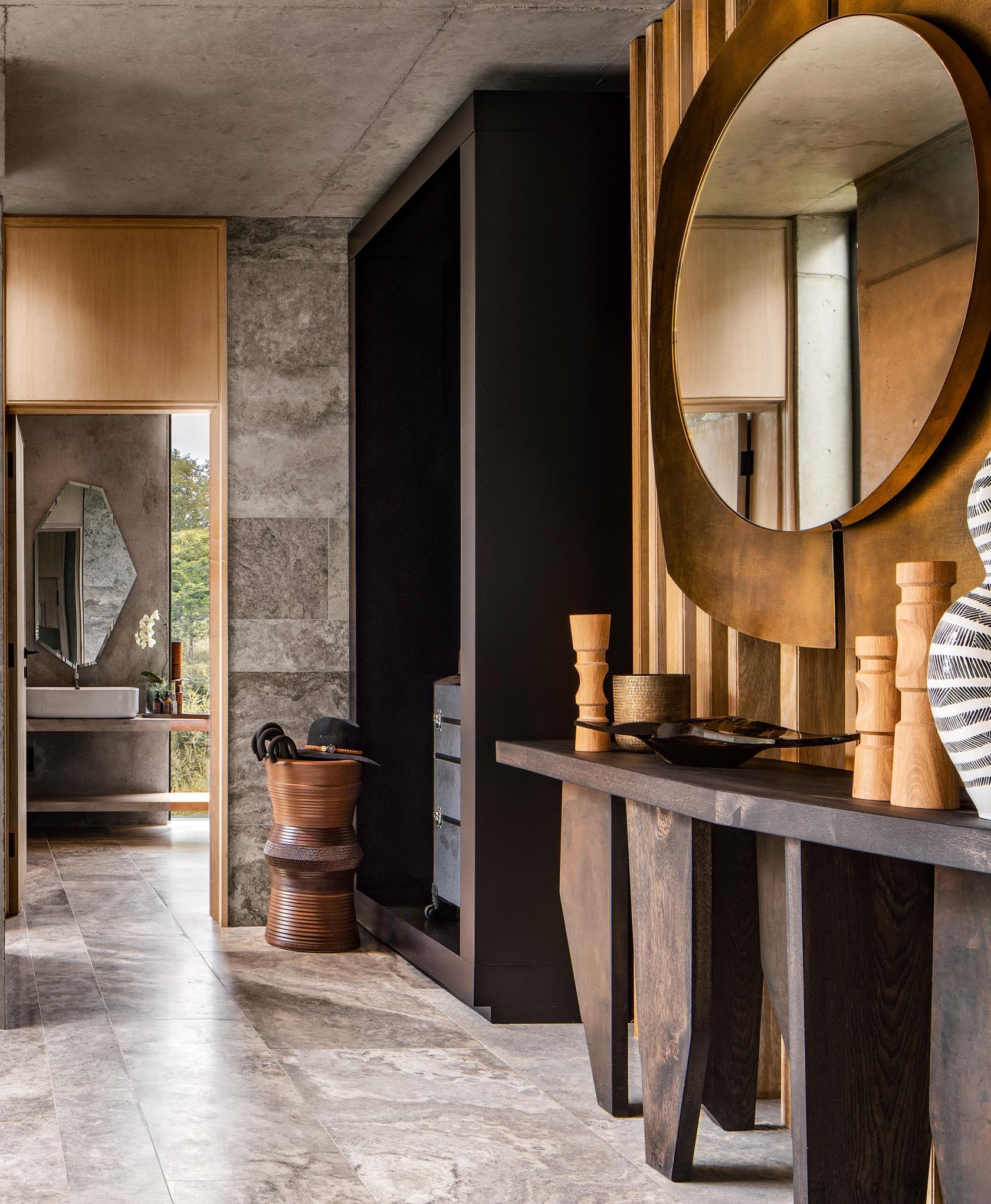 The communal living spaces are each surrounded by four standalone bedroom suites, almost large enough to be considered a mini-lodges in their own right. Here, the interior design introduces softness and texture – at times retaining a certain grittiness with rough stone walls, raw concrete, weathered steel and sheets of glass. The bedrooms suites themselves each have a generous open-plan lounge and bedroom space, plus guest toilet, and a walk-in dressing room. The bathrooms open directly to the outdoors, offering an exhilarating open-air bathing experience. A unique sense of place is carried through in the abundant use of locally sourced natural materials and bespoke designs handmade by local artisans. Organic natural forms are abstracted in the patterns, forms, and rhythms of the interior design. Richly textured fabrics, aged leathers, and wood grains have been subtly offset with sleek details in gold, bronze, and black.