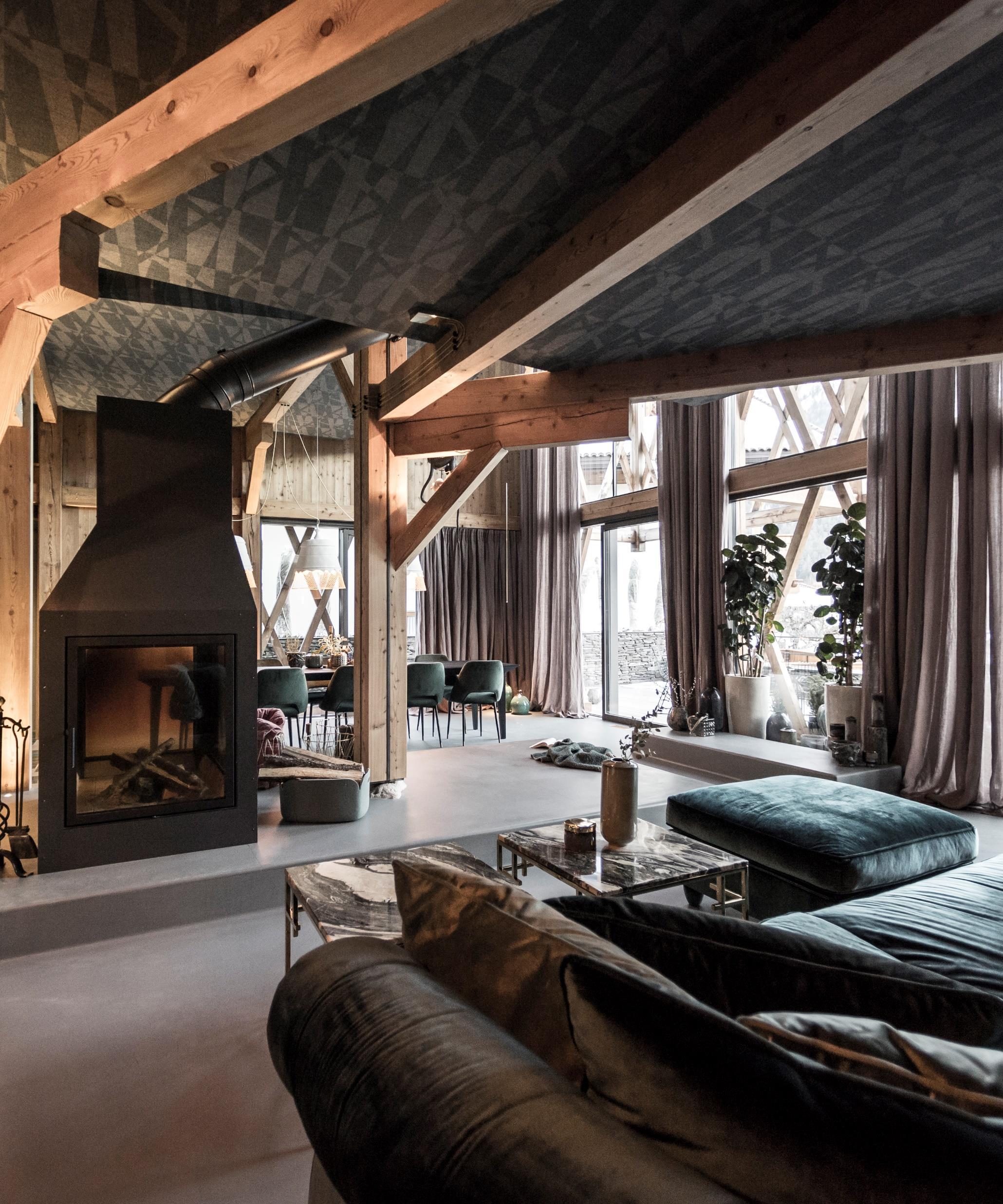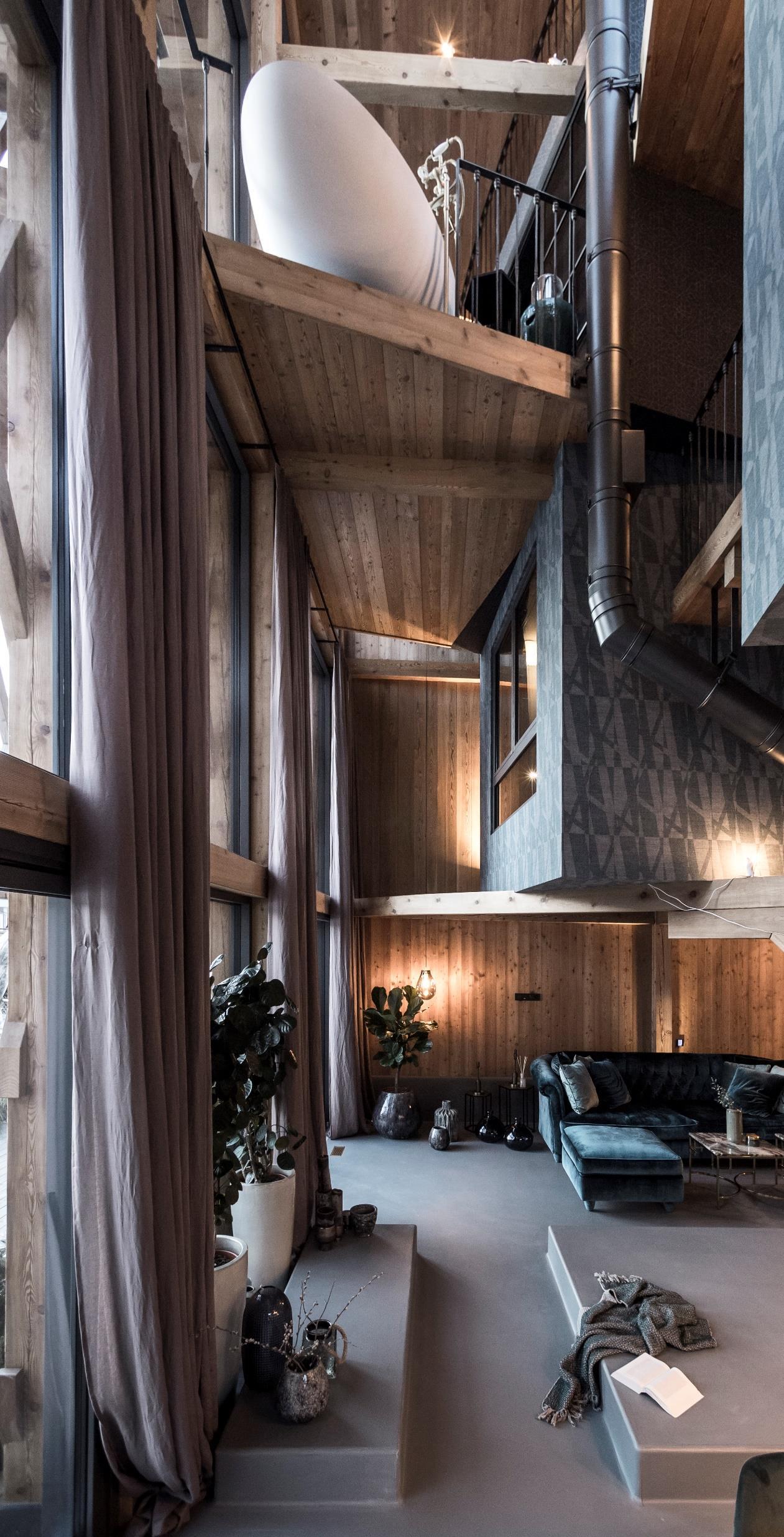 The house contains three bedrooms supported by the wooden beam structure, visible in its totality. Each of them is designed as micro-homes, each one having its own particular design, these boxes seem to almost ‘hang’ in the ample volume of the interior. One gains access via a staircase and a walkway system, which as well as having a connecting function, accommodate the ‘bathroom’ areas with tubs and showers. On the last floor, a box plays host to the sauna with a panoramic view, extending out of the southern front. Preceding the sauna, there is a book-lounge with an antique majolica stove, which has been taken from the pre-existing building. The library together with a cloakroom area complete the private spaces on the higher levels.