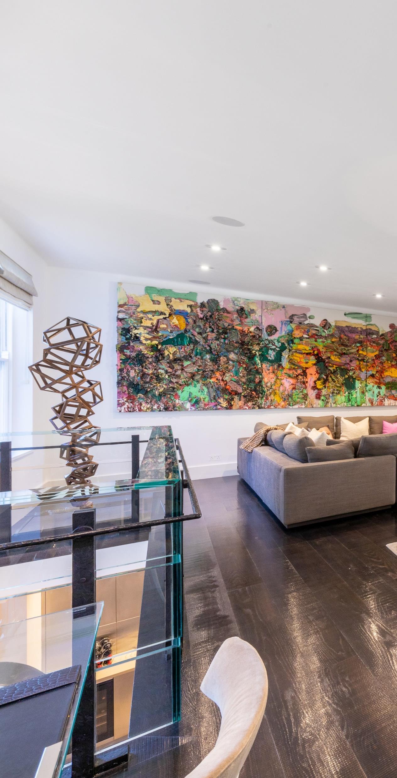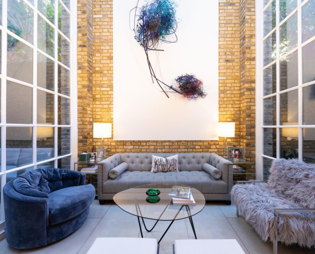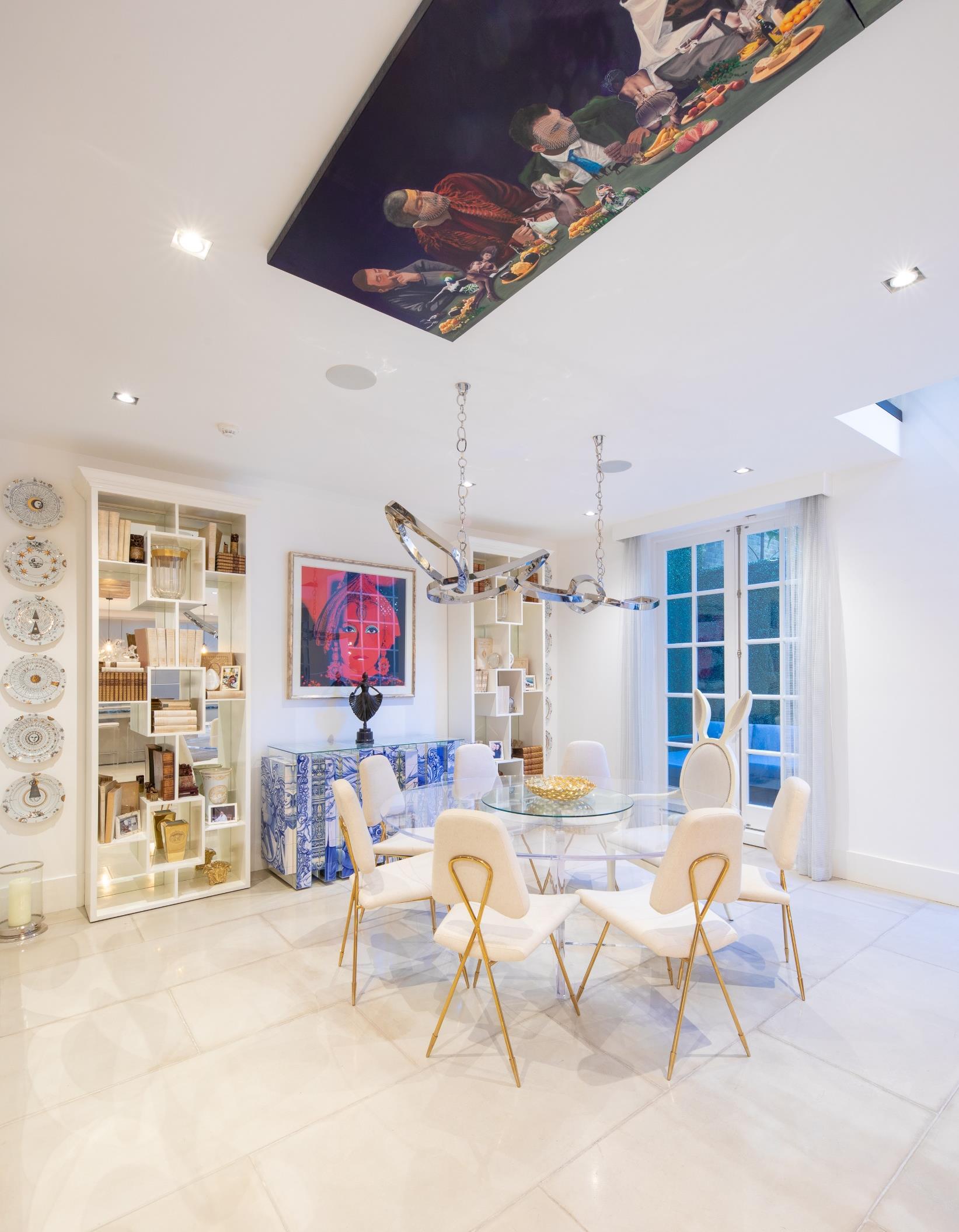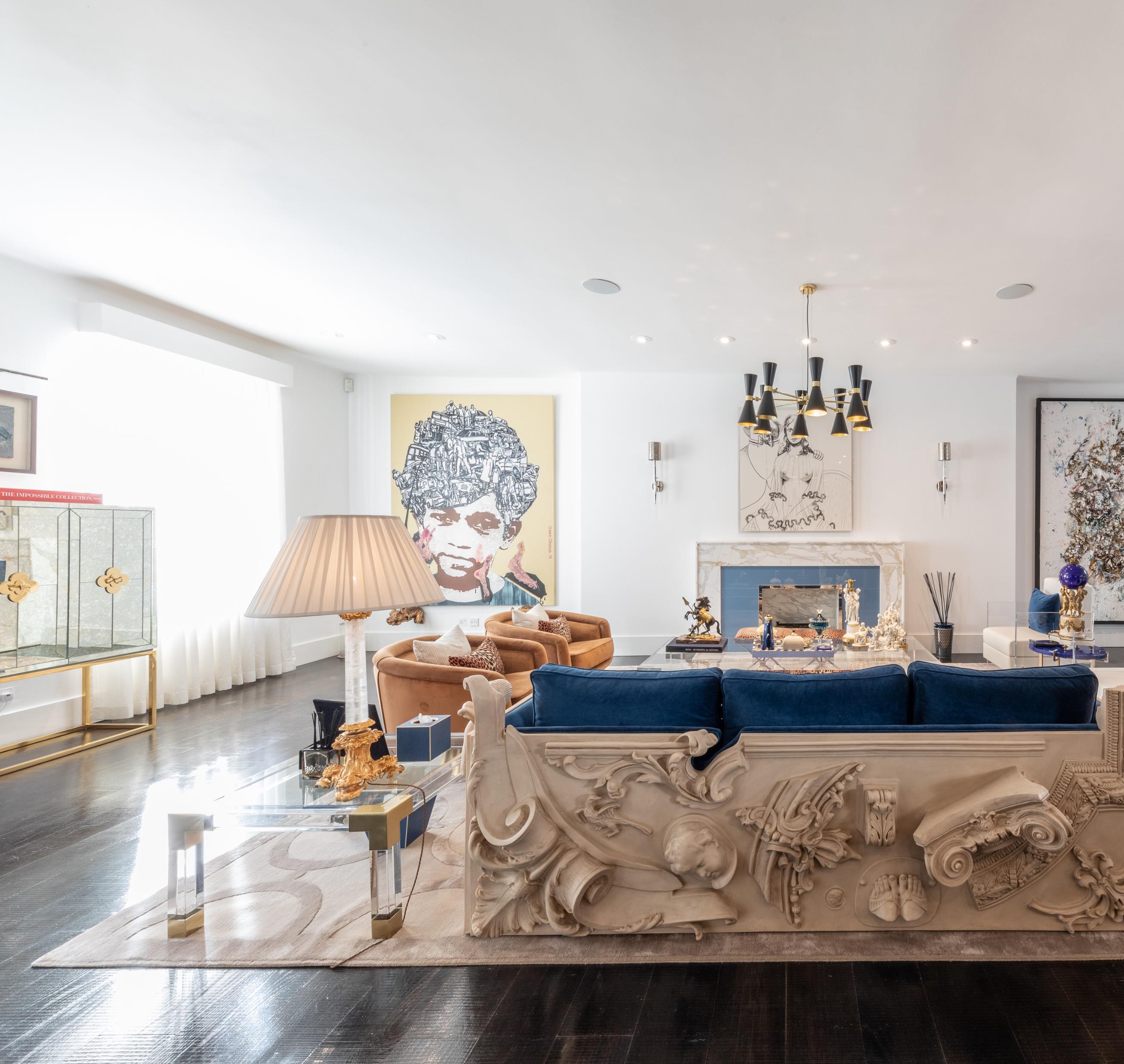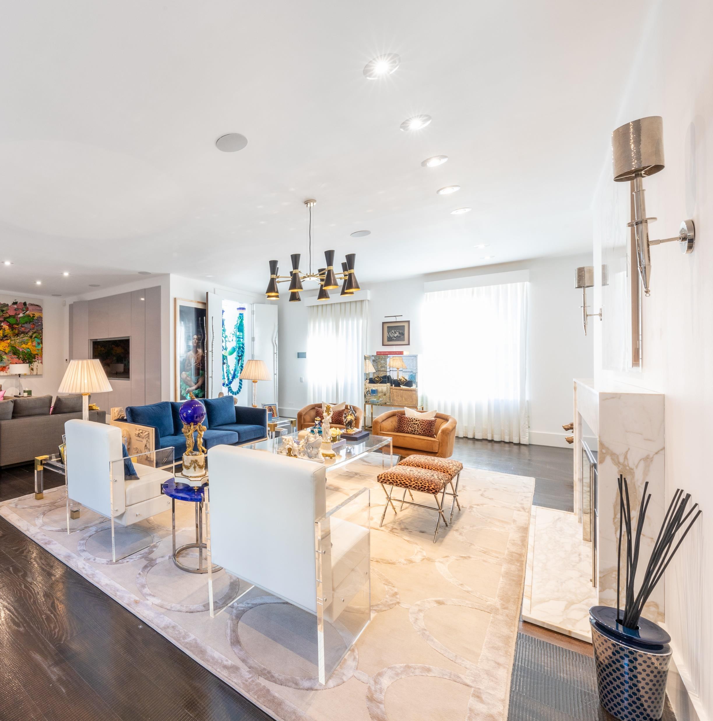Right in front of the firework stands out opulence and wide-open eclectic living room. Art is detailed in every piece of furniture in the house Contemporary and maximalism styles are the main combination of the room and together create the perfect juxtaposition.