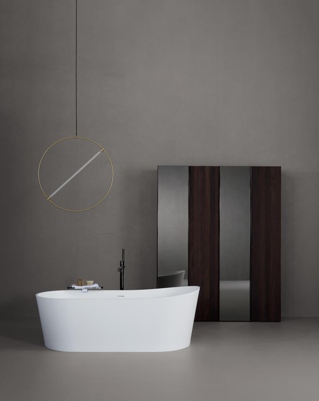Designed by Ludovica+Roberto Palomba with Matteo Bollati and Stefano Contini, the pieces from Giro collection provide cylindrical and elliptical figures where matt solid surface surfaces and the metallic finishes are intertwined. This perfect match with the materials provided make the surrounding accessories shine on the pure white or the crystal turning this collection into a minimalistic perfection but with a striking appearance. www.inbani.com