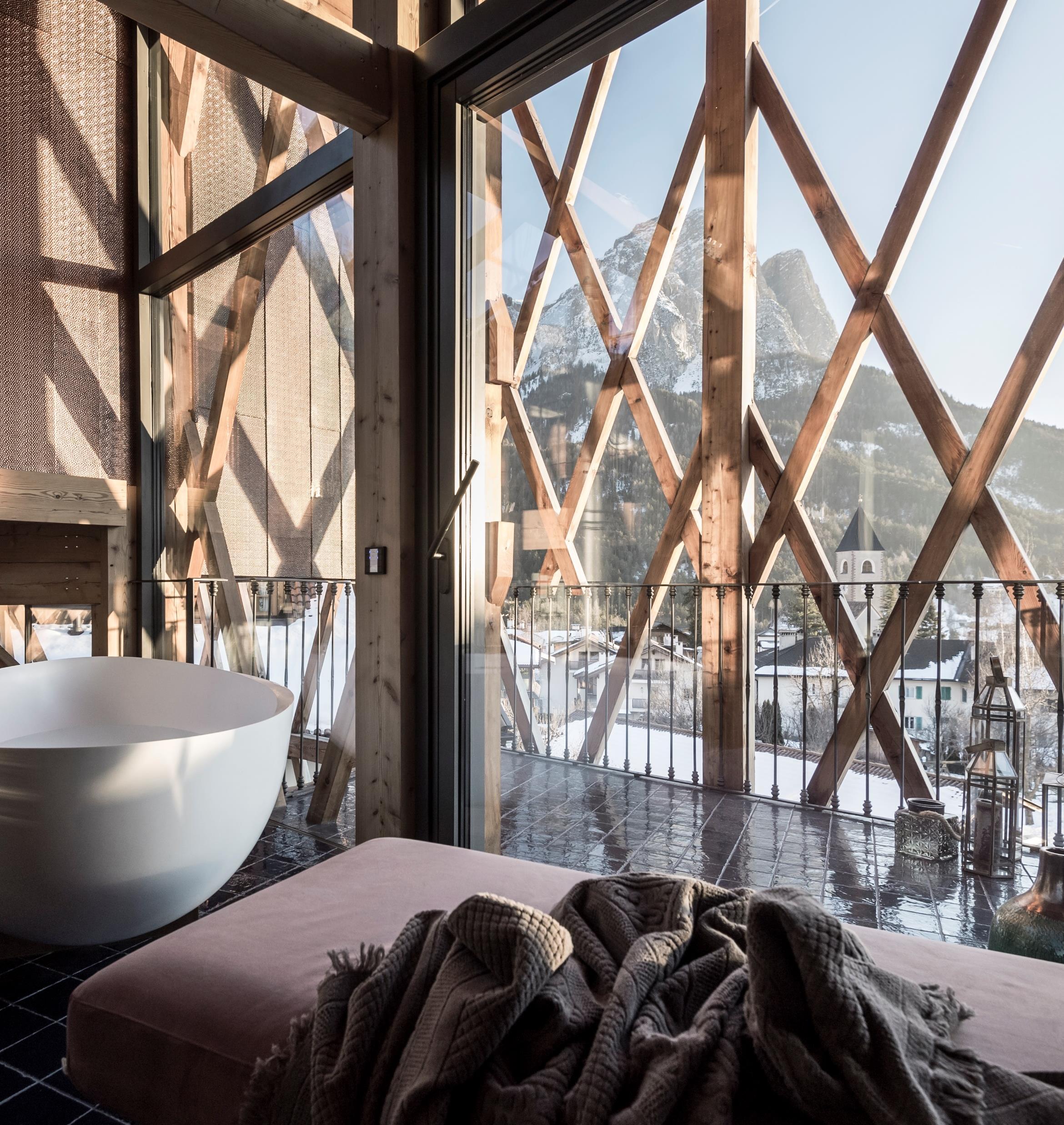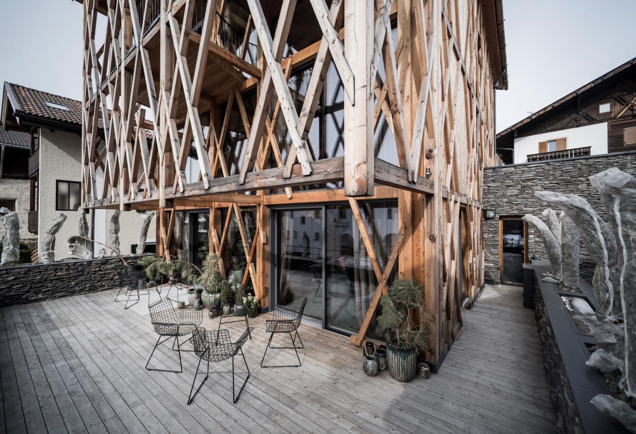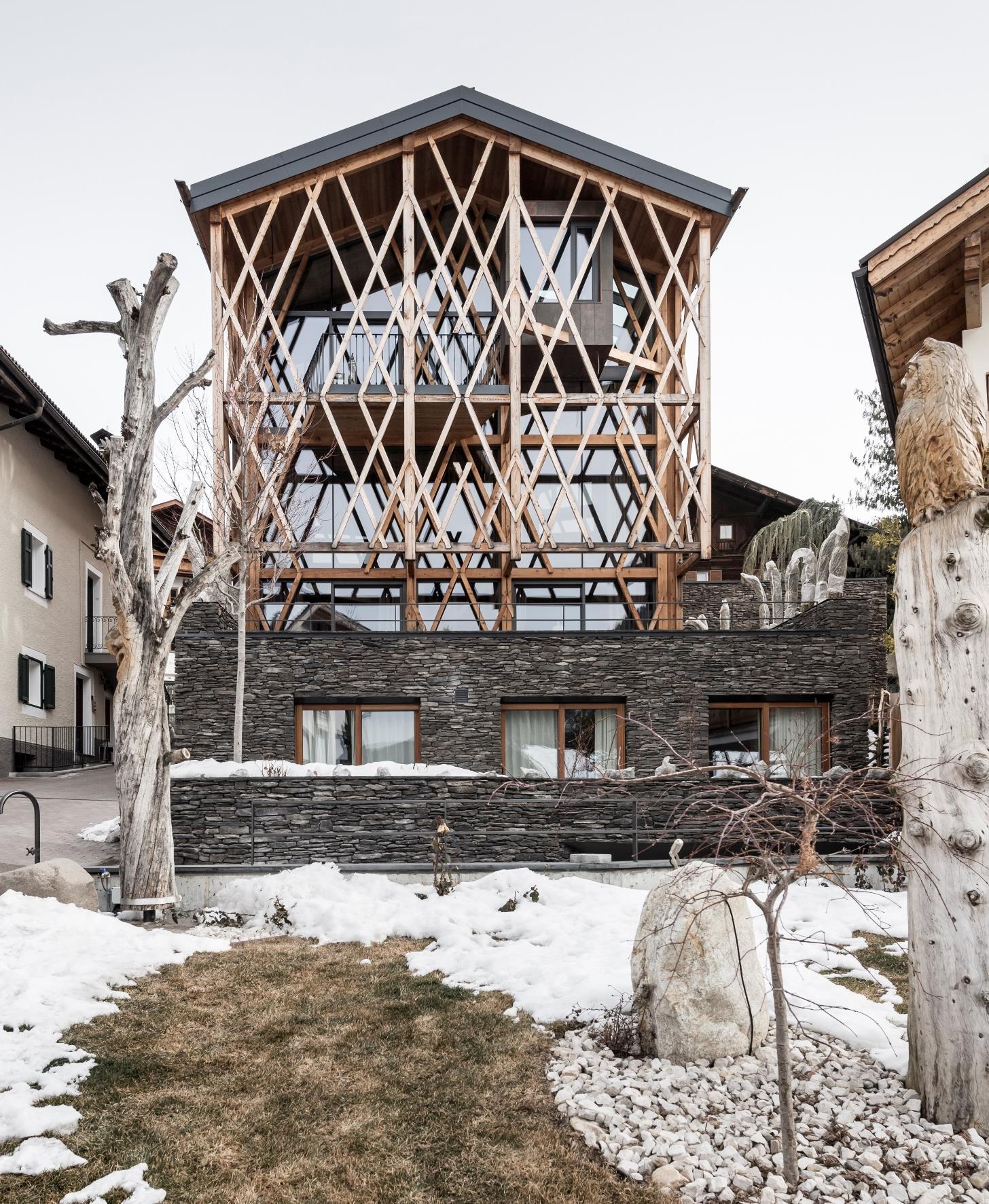 The house mirrors the construction type of the location’s rural buildings. On the stone foundation, is a wooden structure in larch on three levels, and which supports the gable roof, typical of the village’s dwellings. A wooden trellis covers the whole house in a shell-like manner, screening the light and heat of the sun in the hotter periods, and as a whole it is suggestive of the typical structures of alpine barns. One side of the house is formed from a glass facade and a terrace which opens out to the magnificent view over the landscape of the Dolomites..