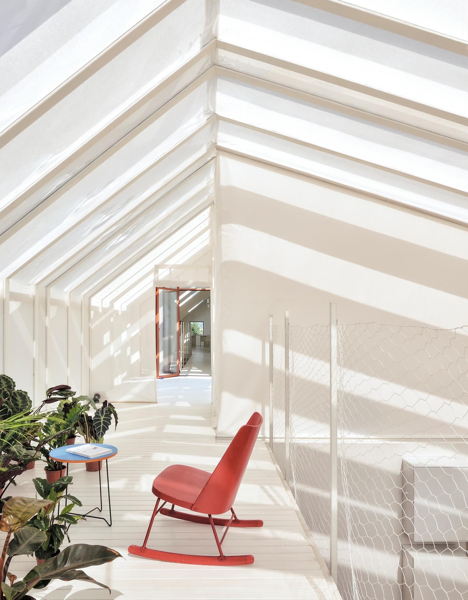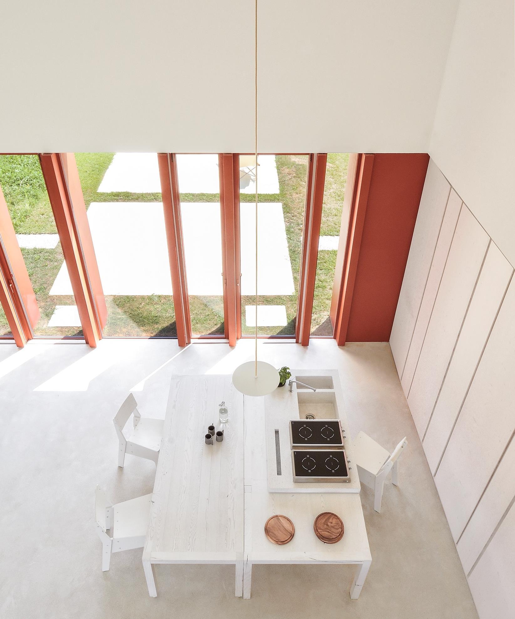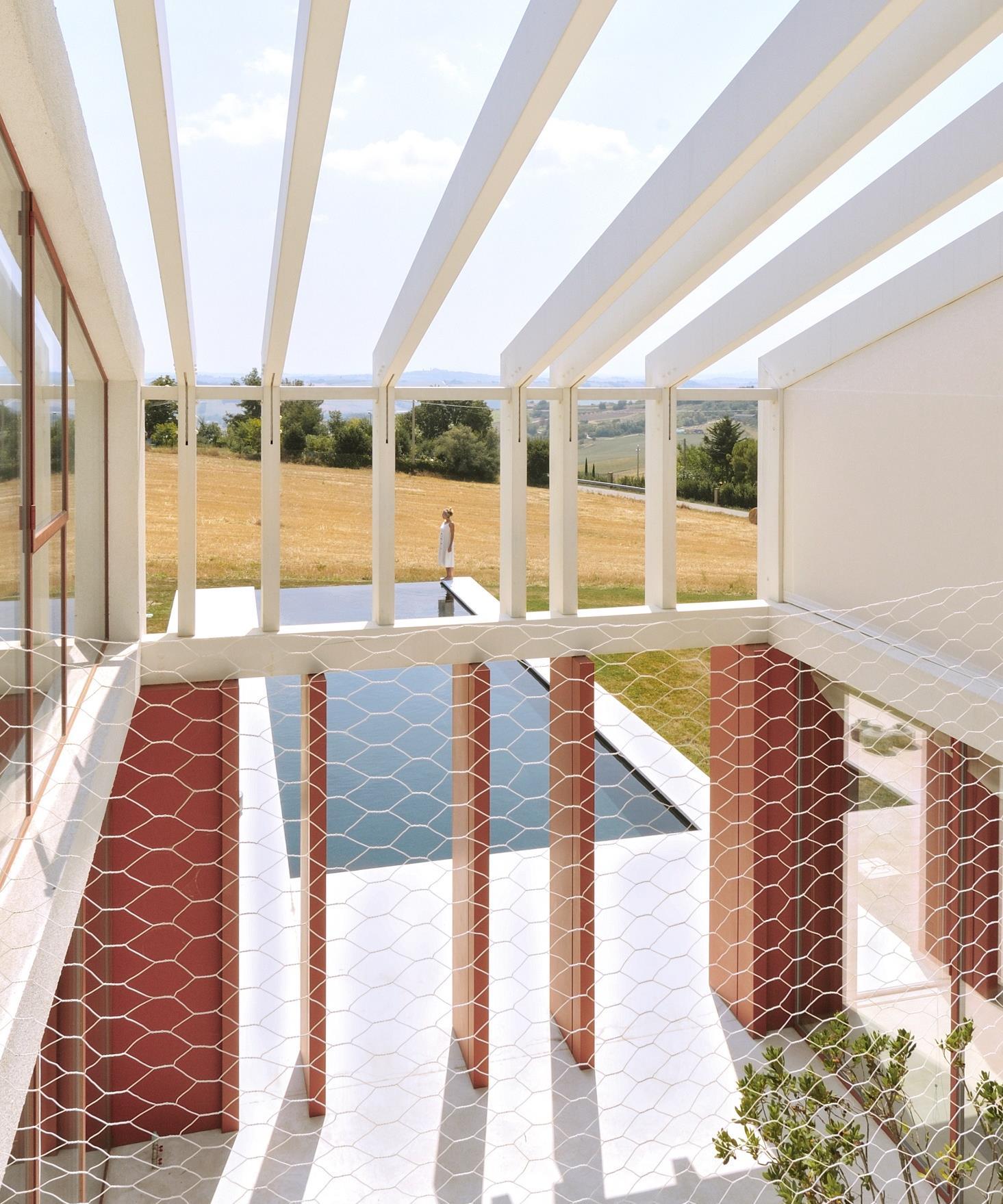 The created space is concave, receptive, permitting the external space to enter and to the residents to enjoy it with simplicity. An ideal line of energy (a cosmic axis) of which the inhabitant can feed himself. He can pass through, from north to south, from the mountains to the sea. Suspension and dizziness are wanted feelings, enhanced by the absence of a conventional railing in the catwalk that distributes the spaces for the whole length of the house, replaced by an ethereal henhouse net.