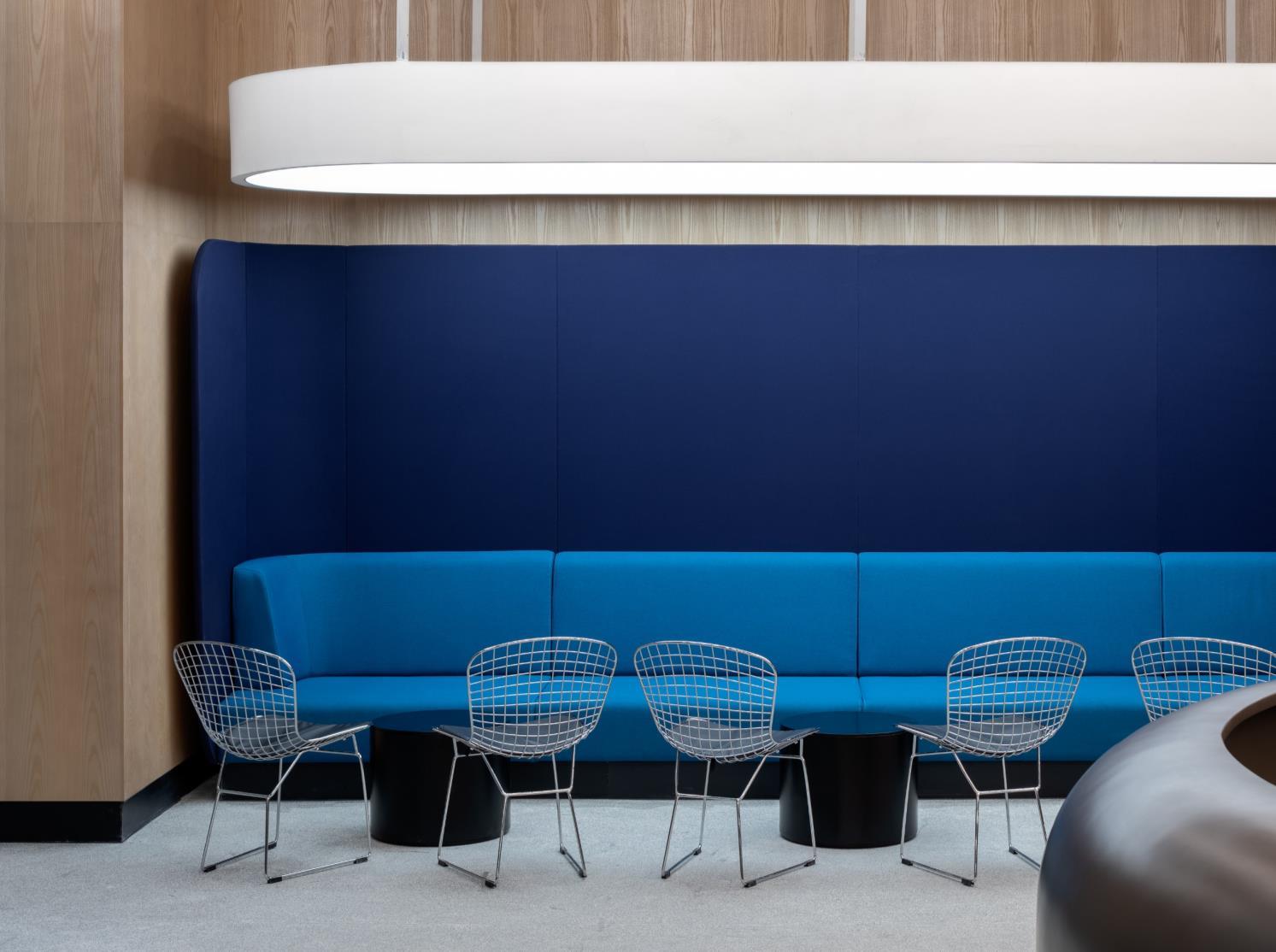 On each of the five levels, users are welcomed in a central reception area. Around the reception area is grouped a diverse array of communication areas: small and large conference rooms, cafeterias and more concentrated work spaces, such as small conference niches, alcoves and acoustically shielded telephone booths