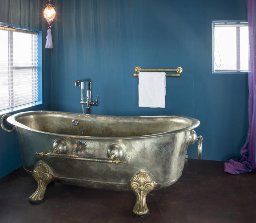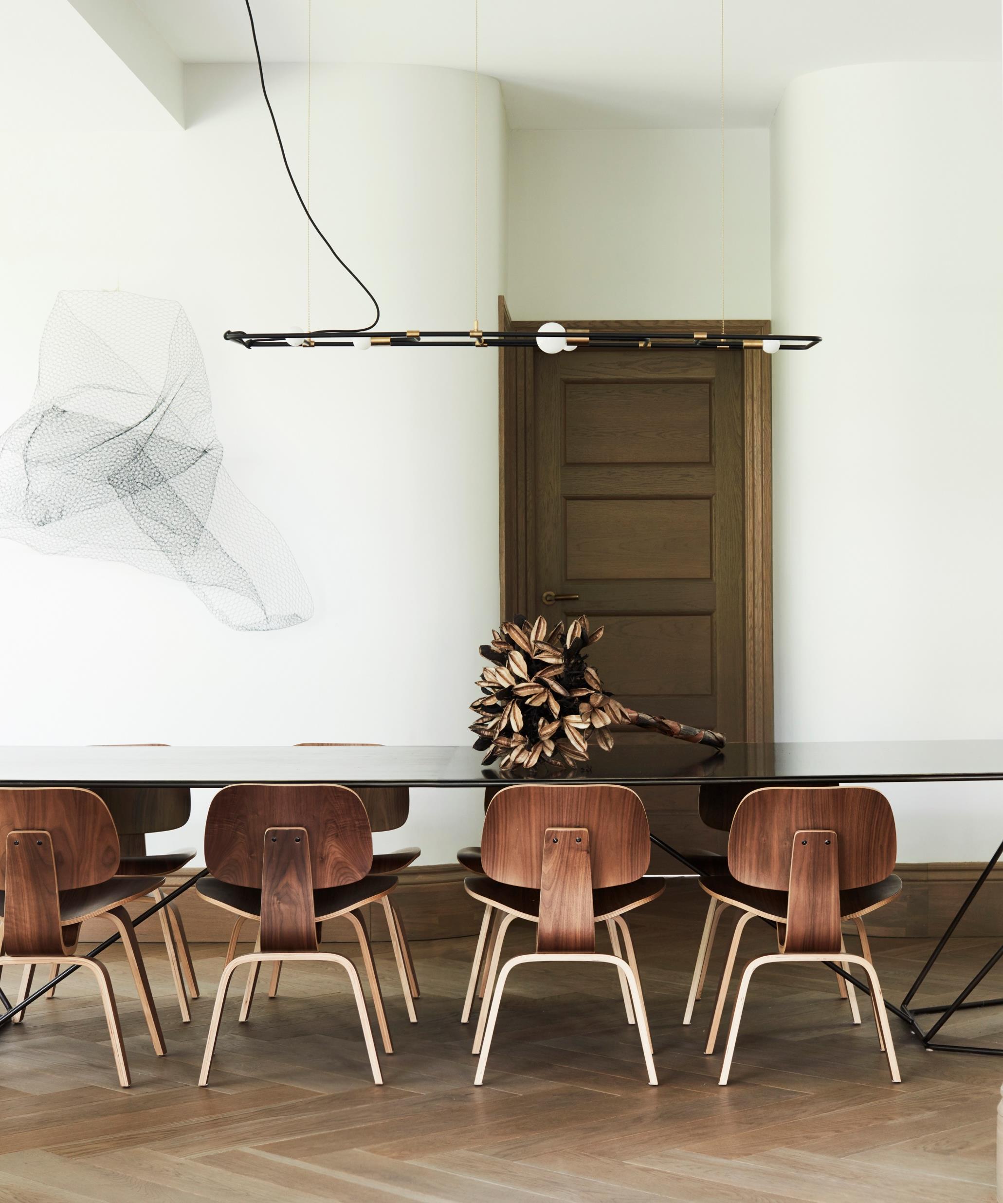The dining table, barstools and server are hewn from carbon-stained wire brushed Ash timber, also used in the frame of signature OKHA “Port” mirror, which, with its copper framed recessed mirror carries a nautical tone of a ship’s circular windows.