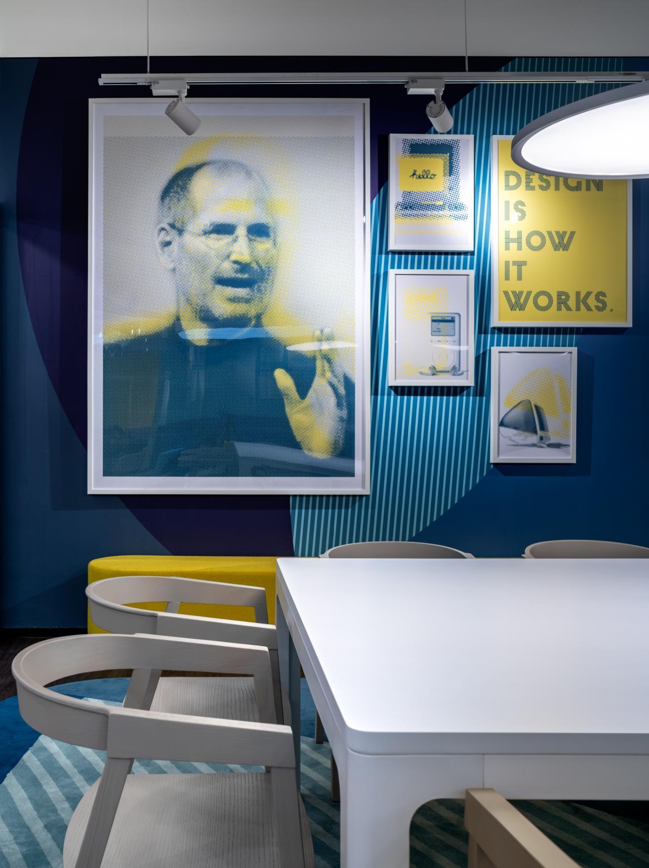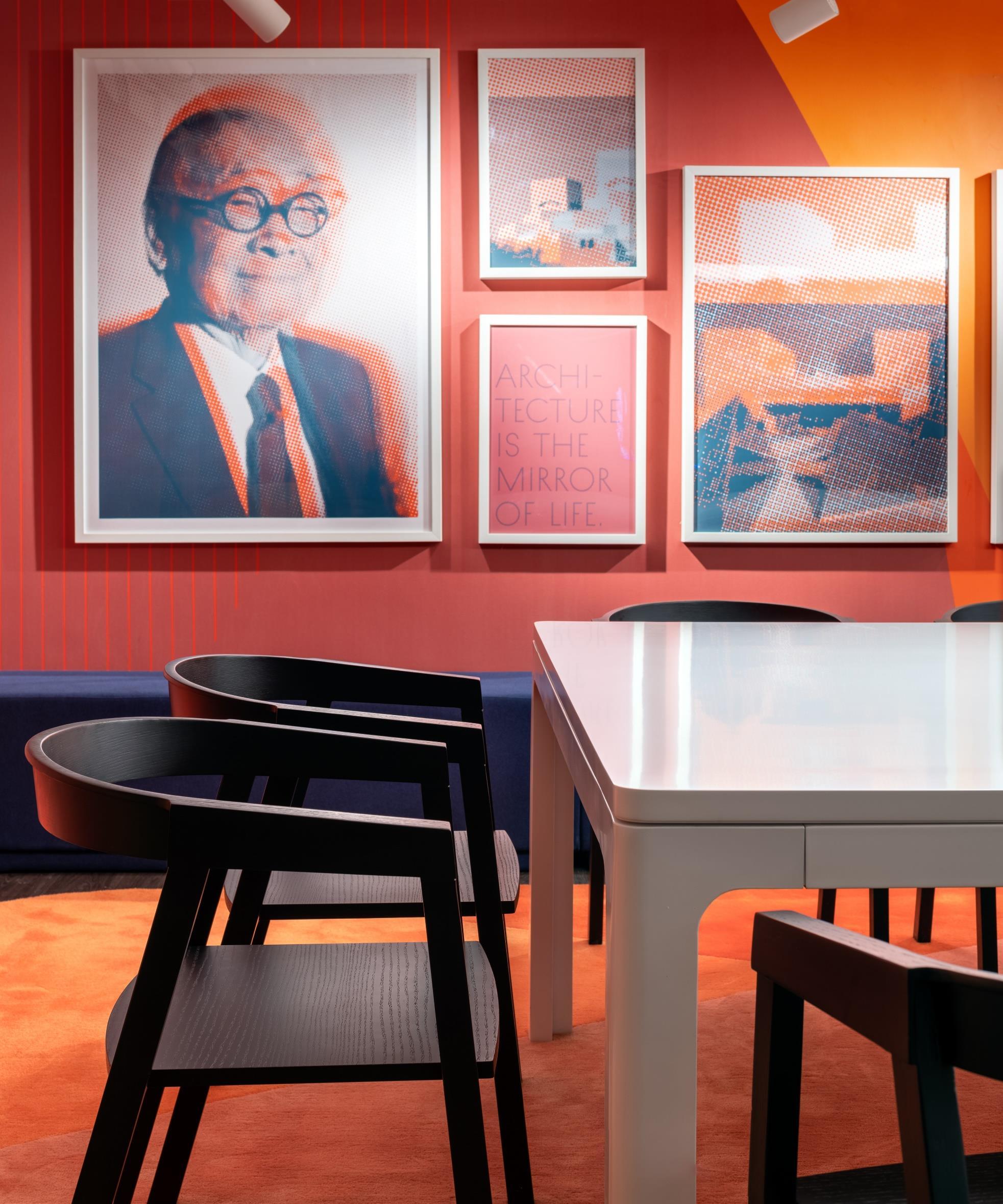 The design language mirrors the energy of the coworking ethos: terrazzo floors, open ceilings and wooden surfaces teamed with bold colours create an inspiring yet engaging atmosphere for a target group that is always on the move. In order to zone such a large area into identifiable spaces, each level is dedicated to a well-known personality, who effected a revolutionary change in perception in their particular field of endeavour: portraits of Leoh Ming Pei, Steve Jobs, Marie Curie, Albert Einstein and Thomas Edison decorate the walls and give each level its unique identity.