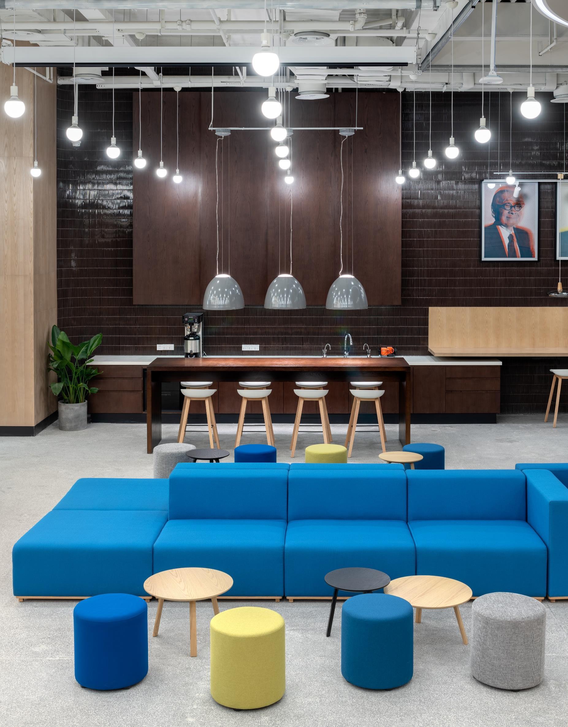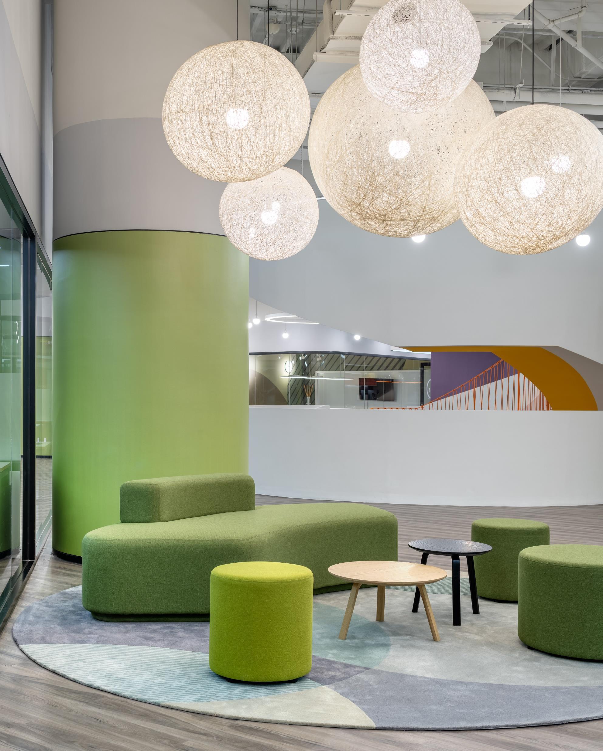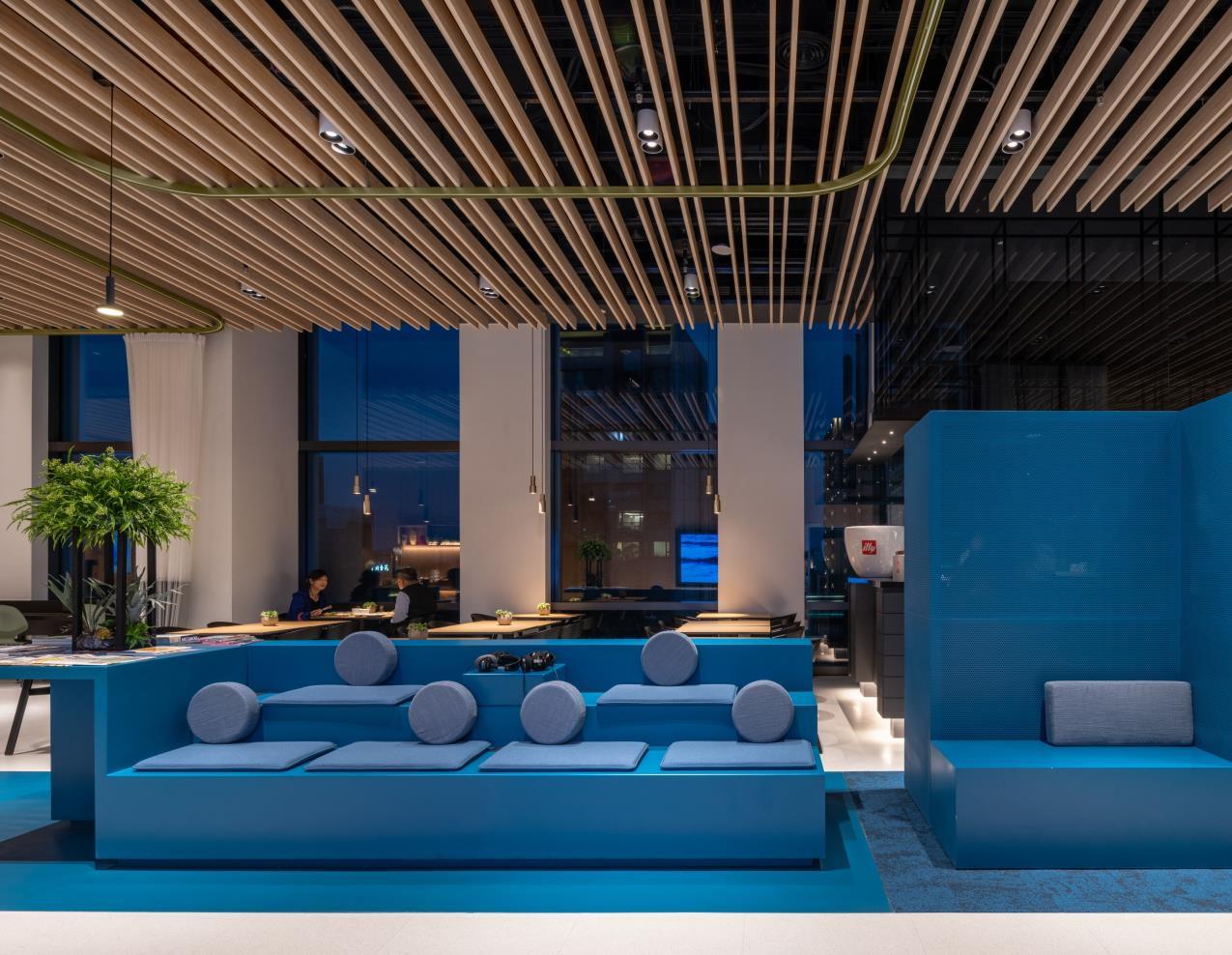 In Wujiaochang, a trendy district with numerous shopping malls near Shanghai University, the opportunity arose to transform a disused department store with 14,000 square meters and five levels into this kind of dynamic workspace. Via the two-level campus on the ground floor, the energy of the coworking space connects with the pulse of the city. The campus forms the centrepiece of the building: a two-level community hub designed for business talks, presentations, formal and spontaneous meetings, and a place to have coffee.