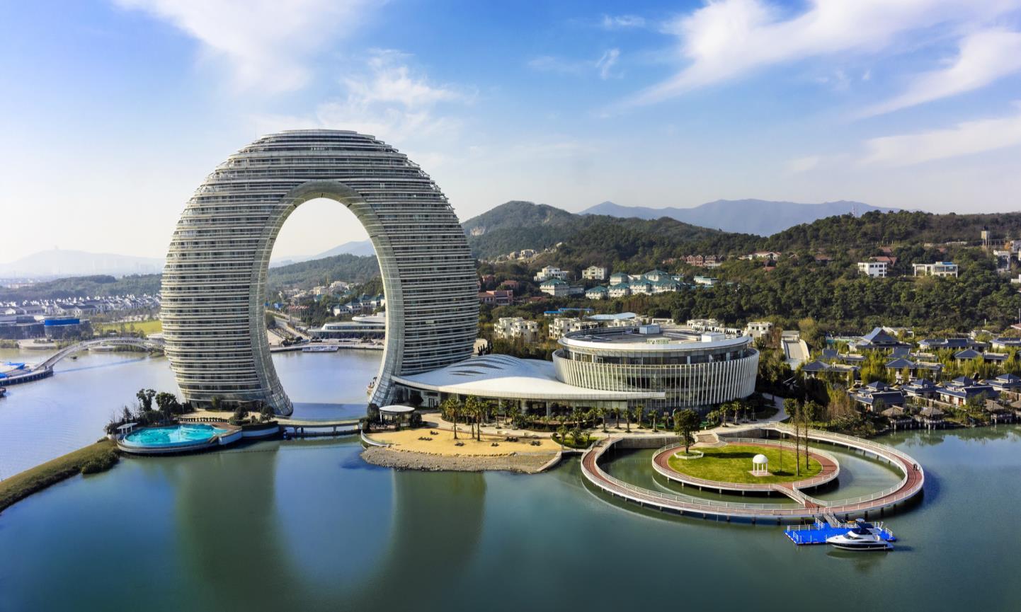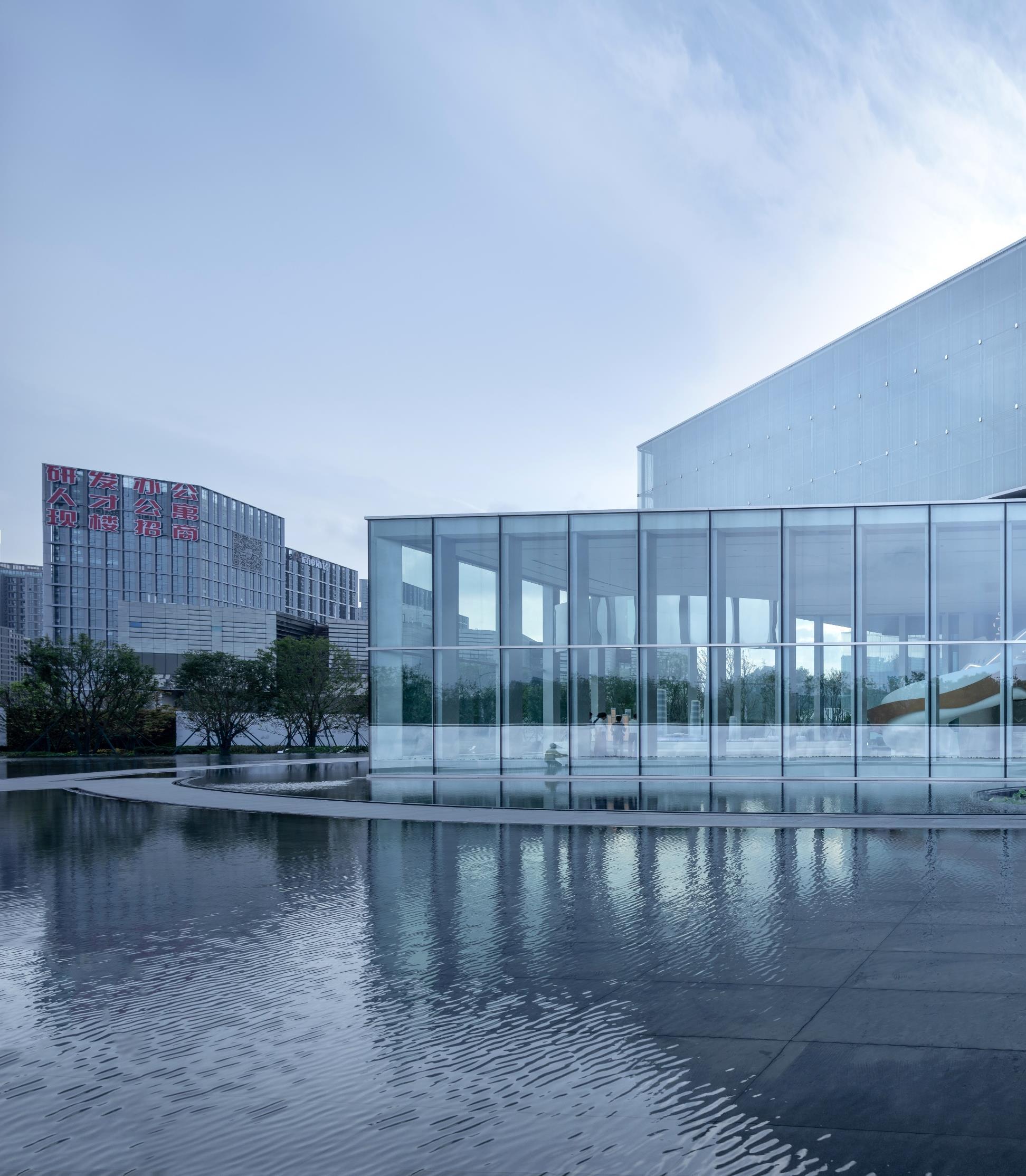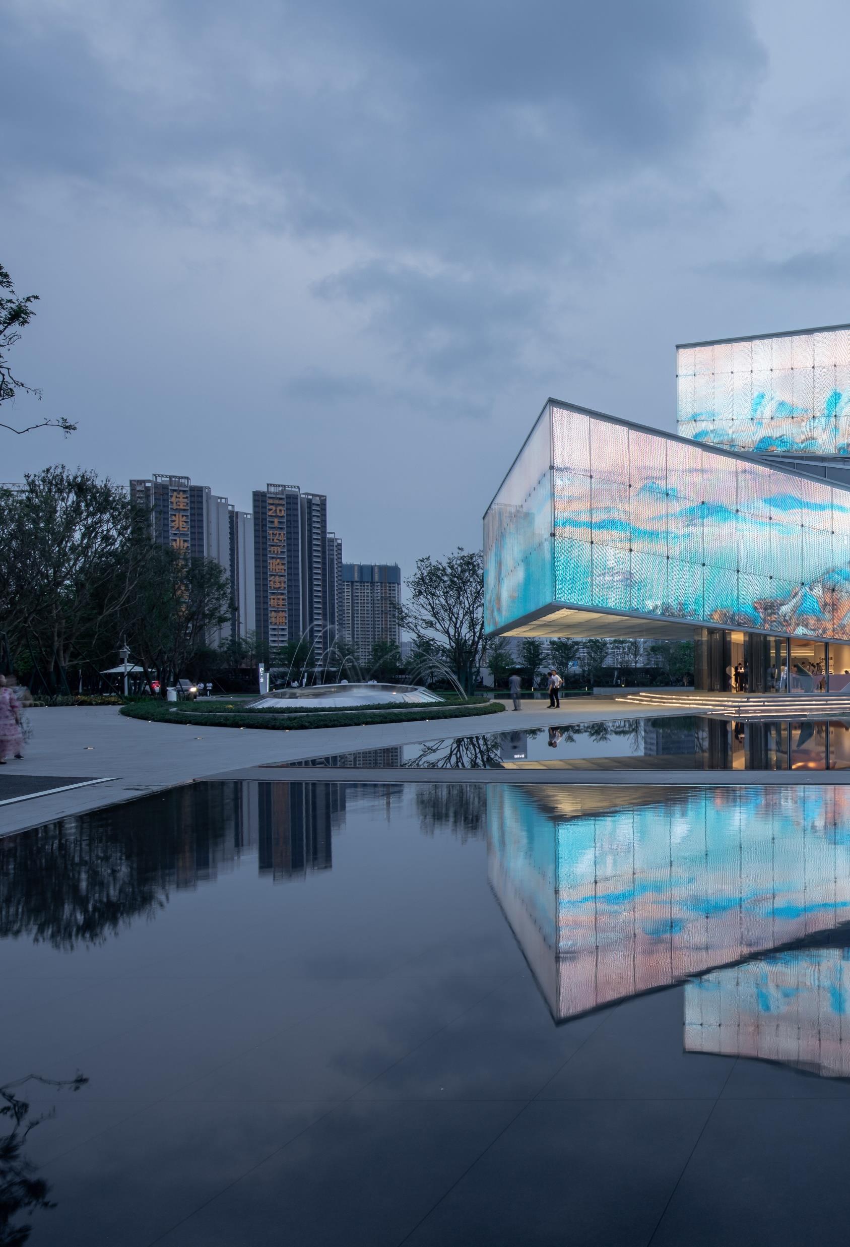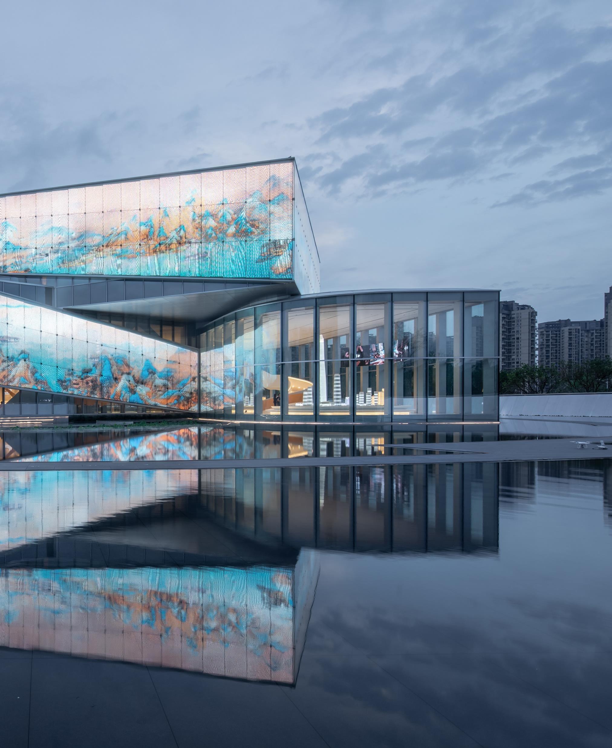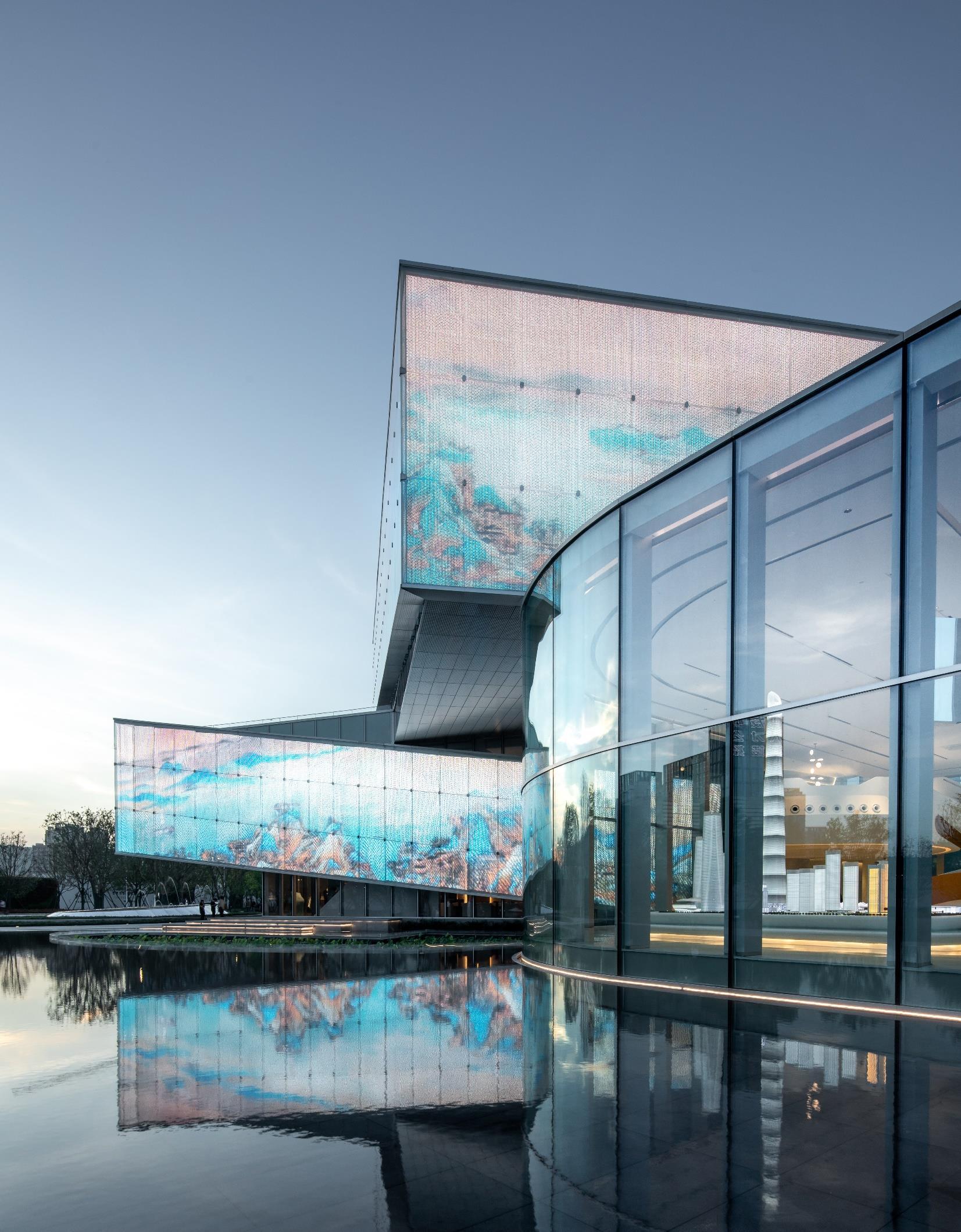 built-in "LED transparent screen" multimedia system. During the daytime, the glazed glass in the sun presents a pure and elegant temperament like the rice paper, looking so peaceful and graceful. At dusk, the afterglow of the sunset falls on the scroll, and the building and the sky glister together; when the curtain of night falls, the magnificent dynamic landscape pictures circle around the building, looking so grand and exciting; at night, the gentle floodlight mode makes the building return to nature, looking quiet and peaceful