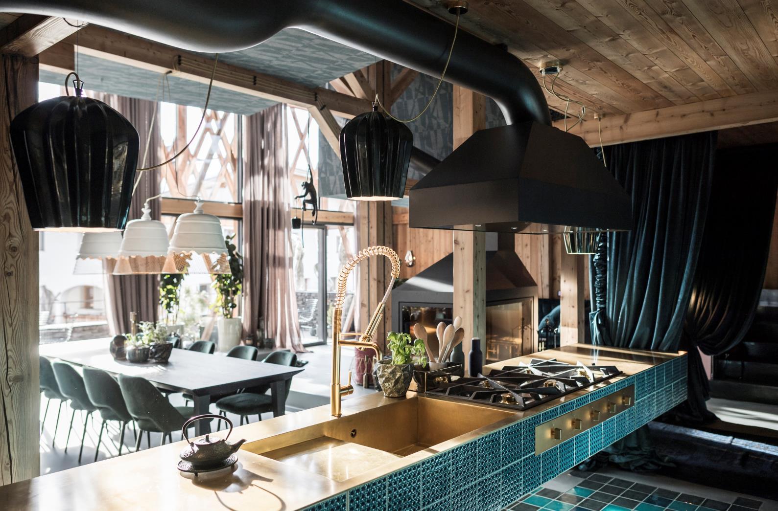 As well as incorporating materials having a local tradition – wood and stone – the project introduces others of a more contemporary nature, in some cases recalling a Mediterranean style. The floor resin, giving uniformity to the ground floor appearance, alternates between baked clay and sea-blue tiles, the same as used for the side covering of the kitchen’s work surface. The brass gives brilliant warm tones to the furniture details and to the work surface which also incorporates the cooking essentials and sink.