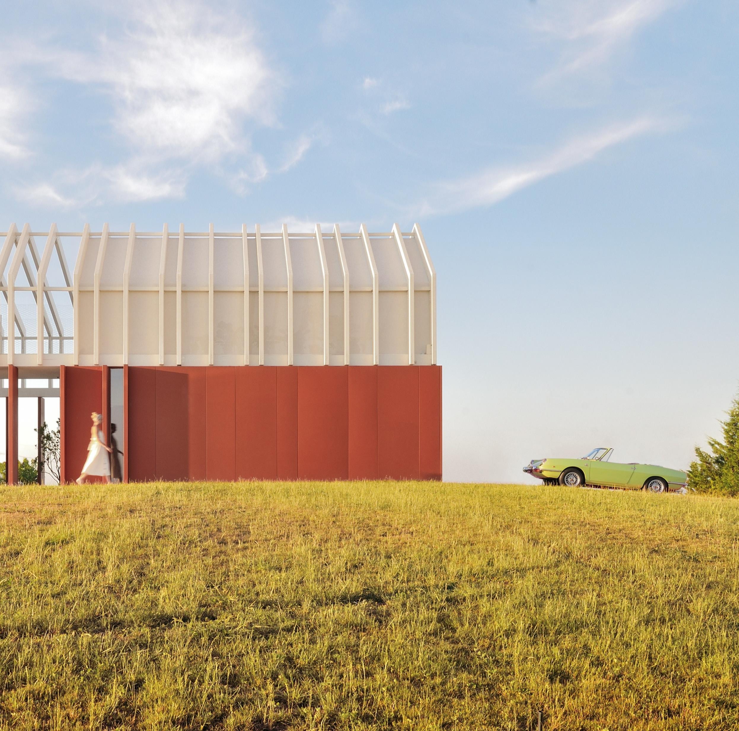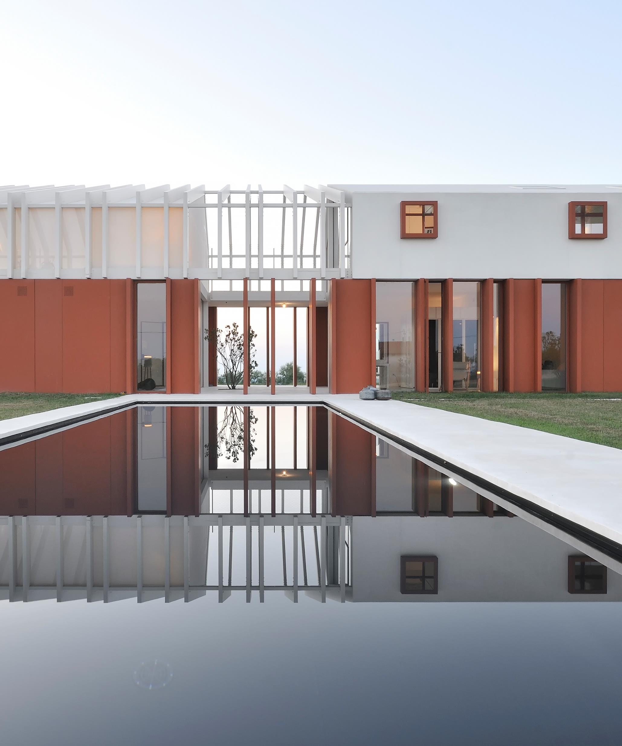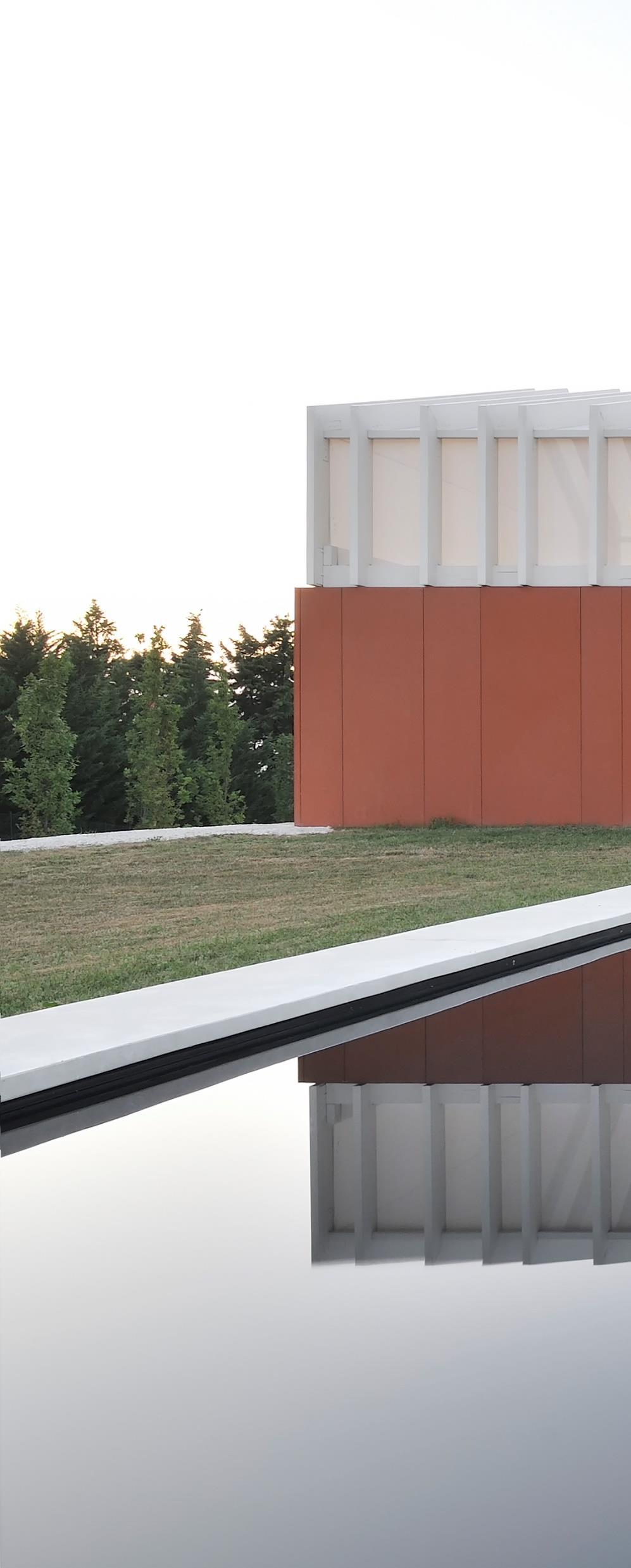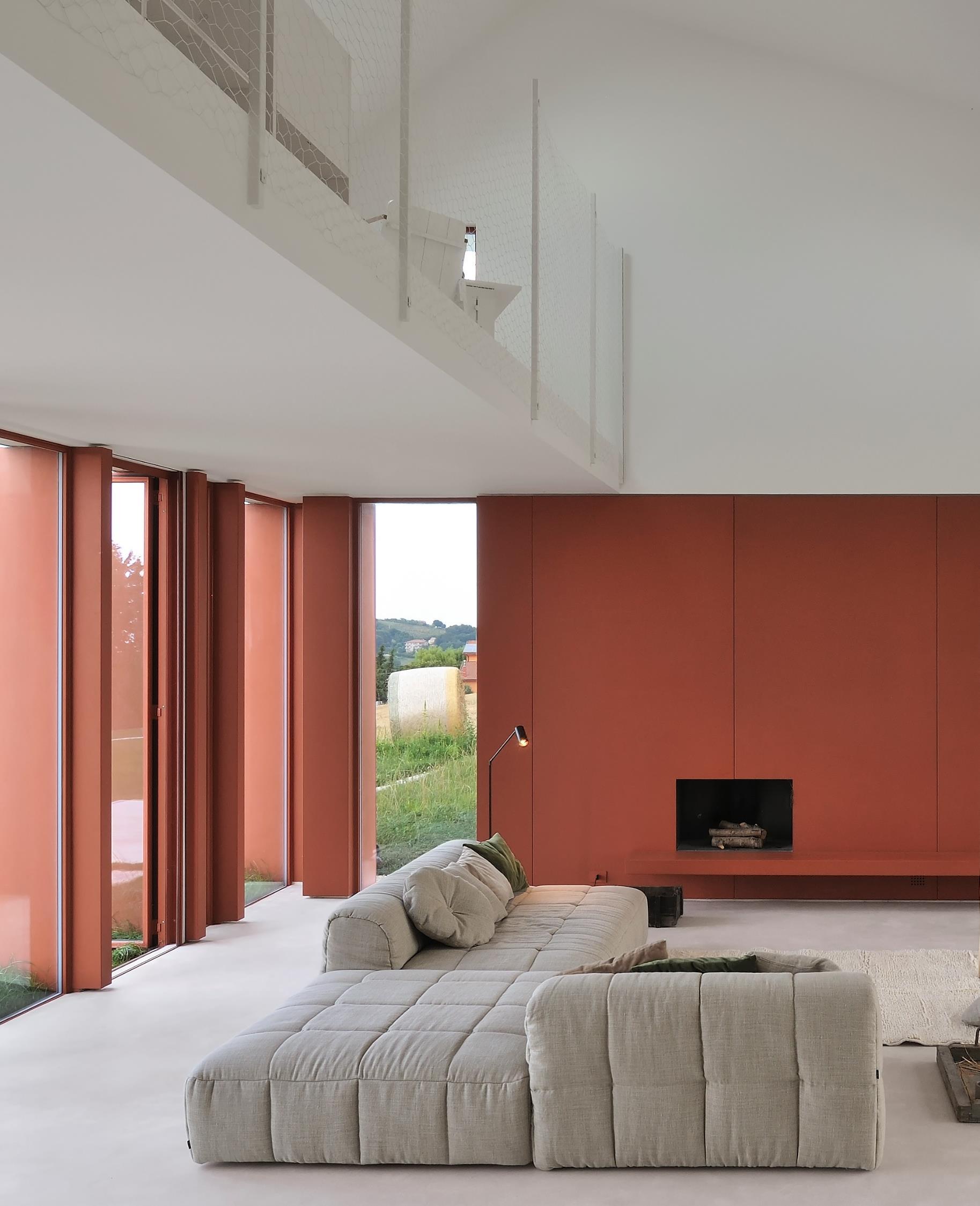 With its prolonged form, the body allows the simultaneous vision of the two sides of the ridge from any environment, symbolizes the border, the threshold to cross, emerging as the main theme of the project research. The project borrows, from the traditional rural home in Le Marche region, the compactness and the longitudinal development of the building with residential space in a row. The house is located on the outskirts of the urban space, where fields grow; the permeability of the soil is left to its maximum, with the grass that touches the perimeter of the house and with the minimum surface of outdoor paving that is detached, isolated from the house There is no fence to demarcates the private property. A swathe of grass surrounds ideally the house in the field (cultivated in rotation with grain, barley, sunflower) expanding it. The attempt is to break the border, without following the