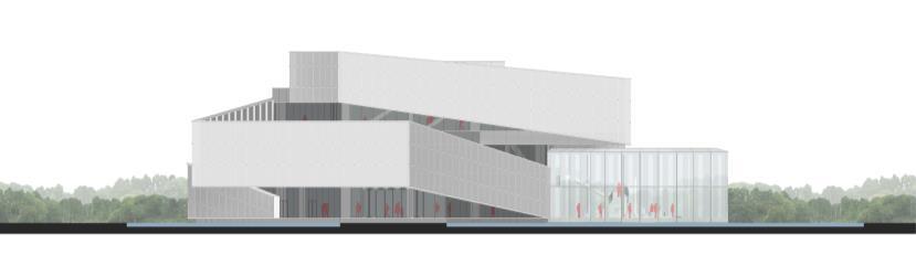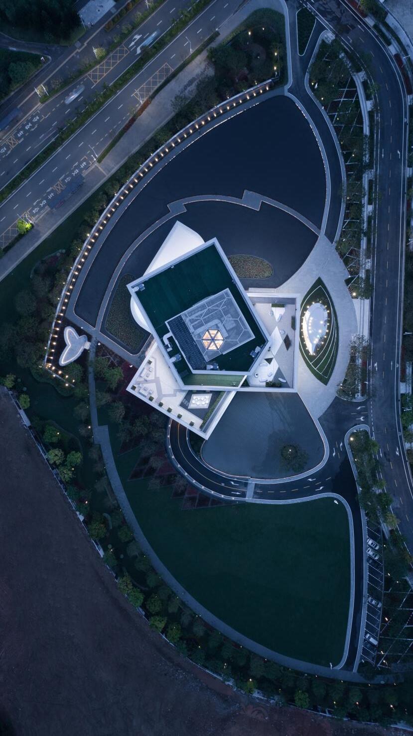 The gallery is floating above the water mirror, with pastel reflections full of interesting contrast. The tensile structure has overhanging layer by layer, changing directions all the time, and adding radiance and beauty to the surrounding field. The "Spiral Scroll" is circling and circling upwards, creating a hazy, tranquil, or grand, magnificent architectural atmosphere in varying periods of light and shadow. The "Crystal Exhibition Hall" of the core exhibition space is embedded in it, which shows the artistic tone of the public opening.