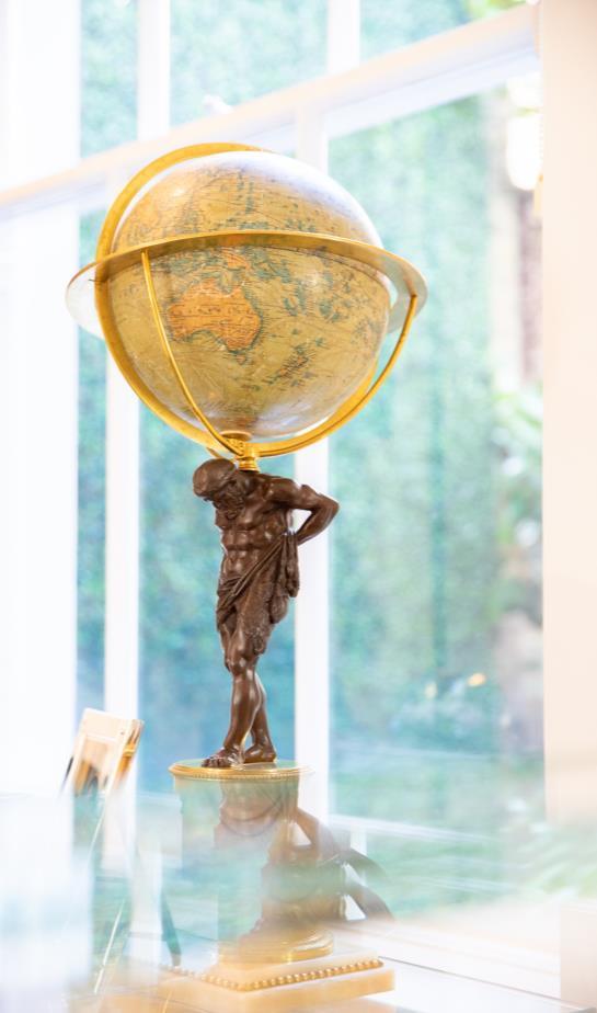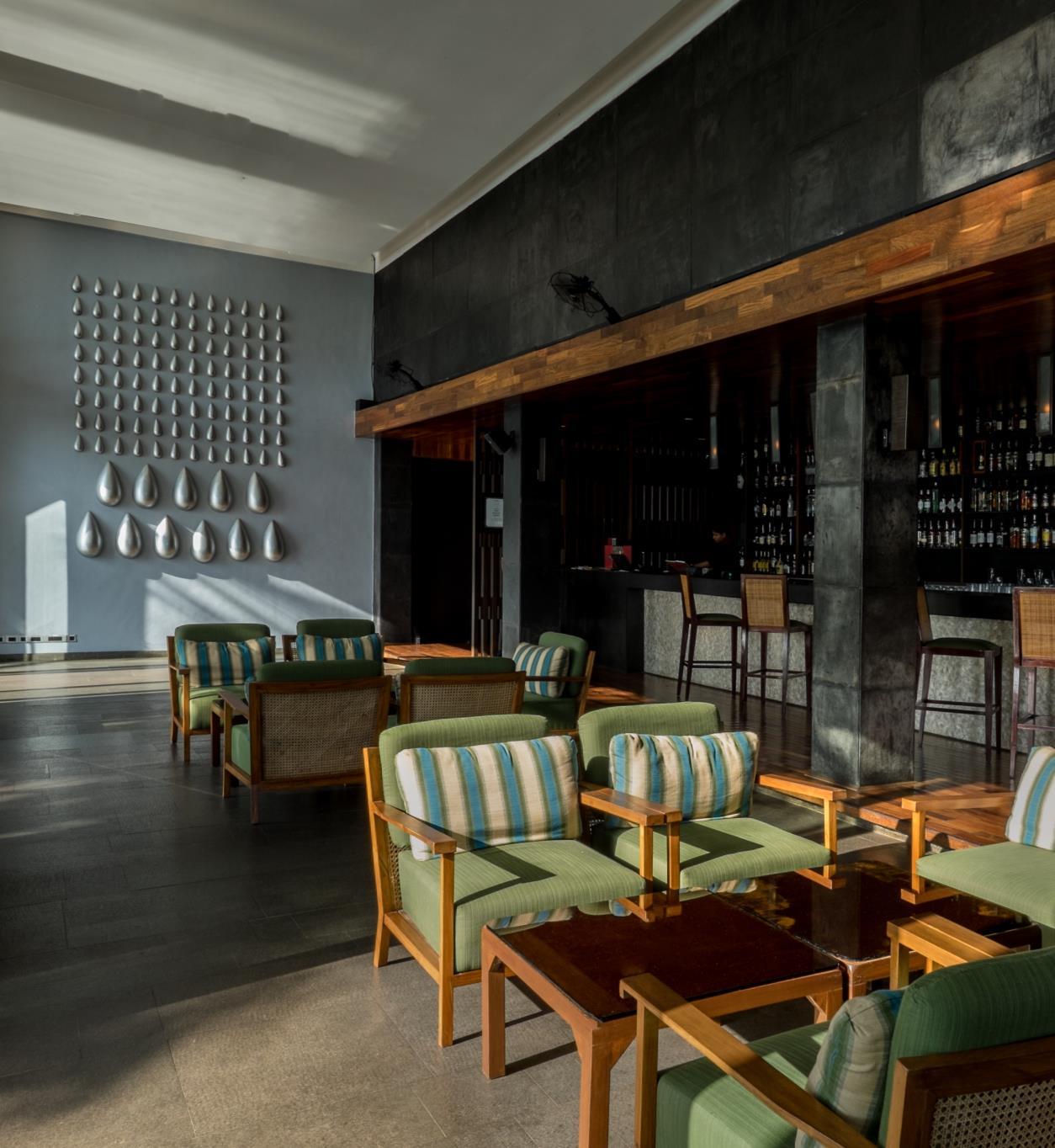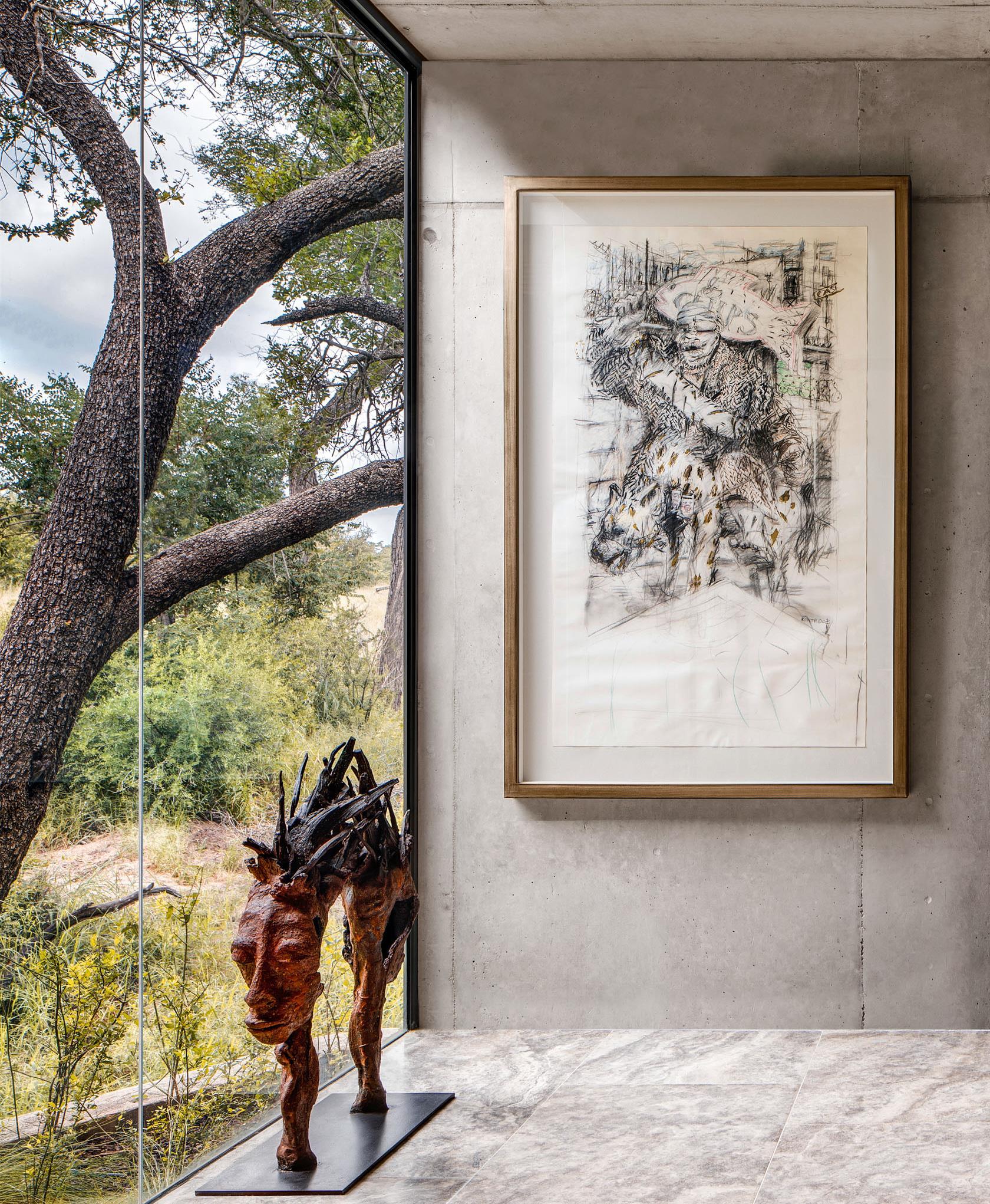 Martin Doller reflect and refract the natural light from the surrounding bushveld. Each bar has been hand-carved from a single block of Travertine. The walls are adorned with a thoughtfully curated selection of original South African artworks, many specifically commissioned from both established and up-and-coming contemporary local artists. The public sculptures include cheetah by Arend Eloff and wild dogs by Gail Catlin.
