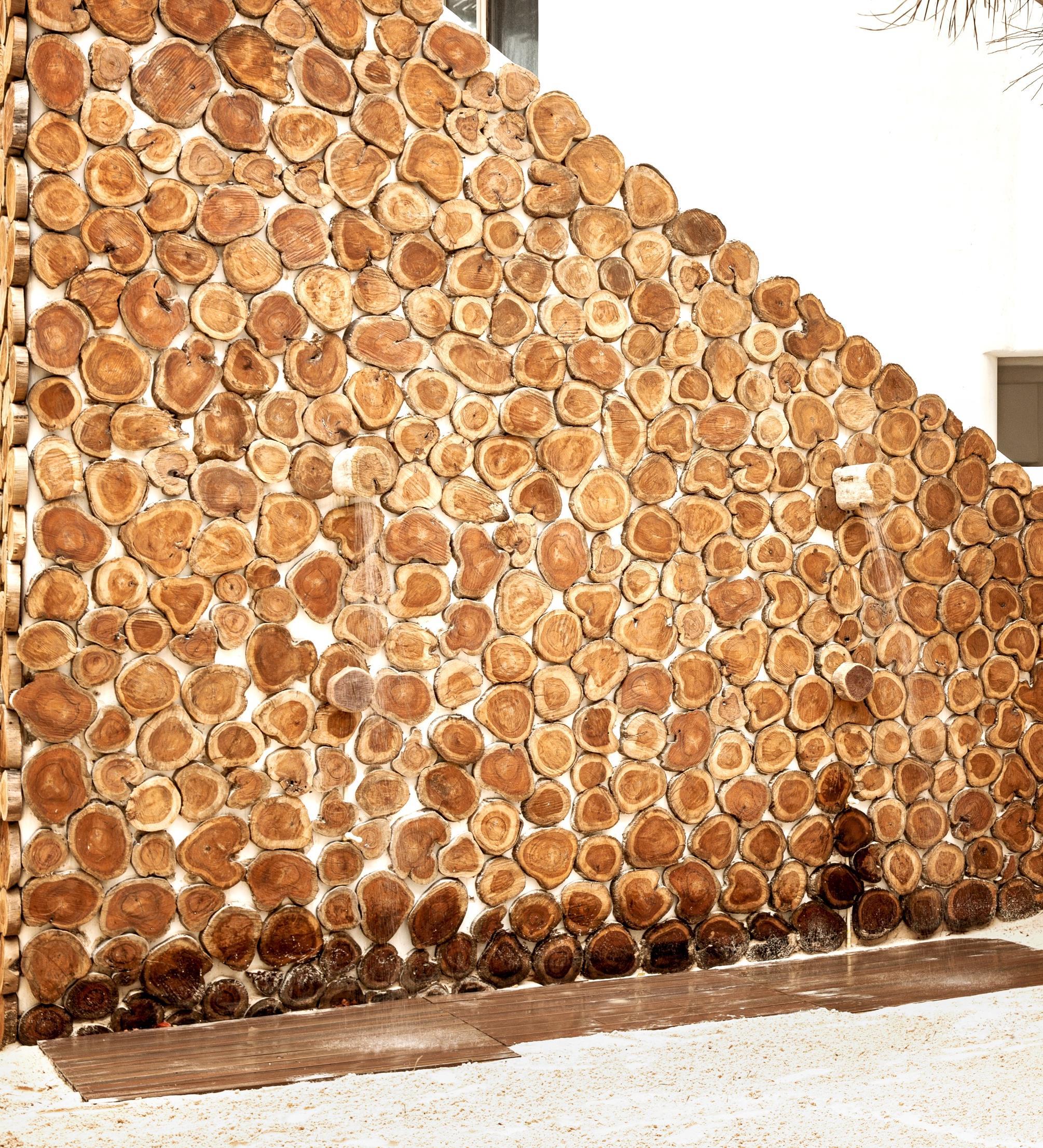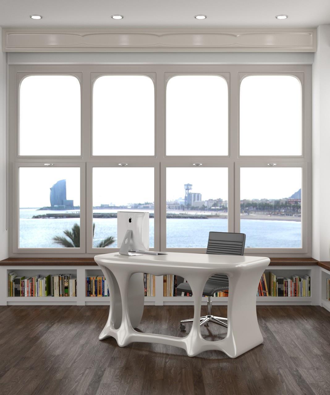 The furniture is in white painted ash wood or in blockboard pinewood panels (only for the doors). Countertops, tables, sinks and basin are designed in cement and quartz.