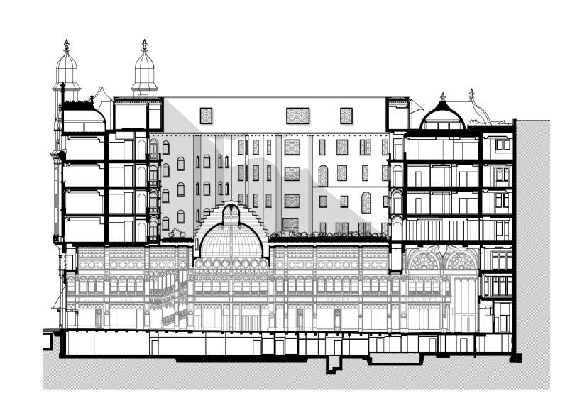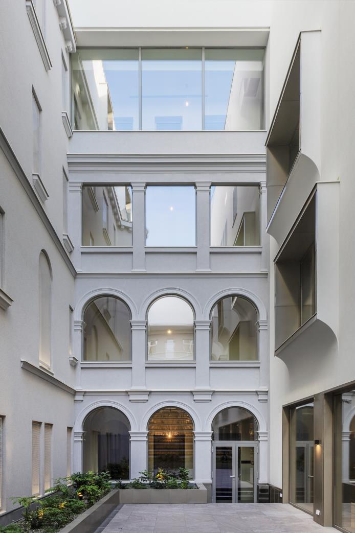 glass dome that acts as the centrepiece for the walkway. Archikon, who has worked on numerous restorations of historic buildings in Budapest, knew that the first goal should be to bring light into the passageway This dome was meticulously cleaned and, where necessary, replaced with the same attention to detail that it had previously been built with A protective casing has also been added to the dome, securing the delicate construction from the elements while still allowing light to pour into the central seating area below. The protective case itself is designed with a tiered set of windows, while a small terrace at the first floor of the residences allows for access to the glass dome, acting a small viewing space into the arcade below.