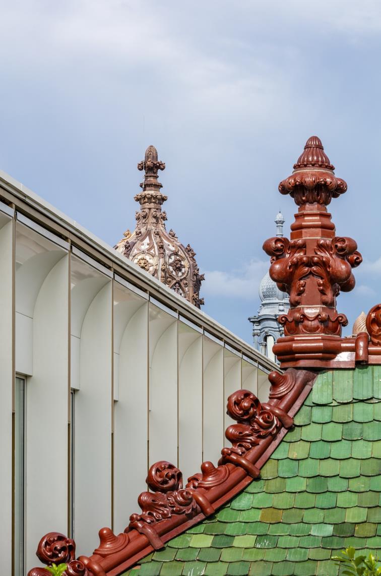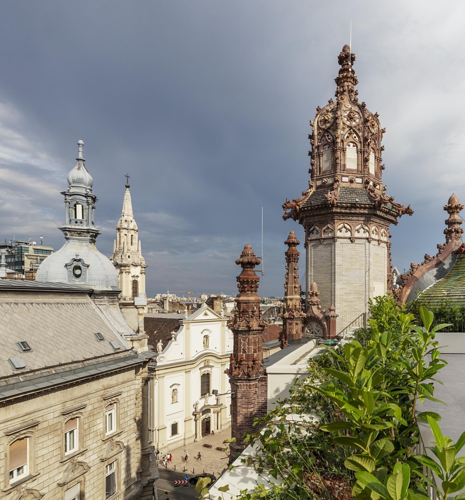The terrace provides immediate view of the building’s original rooftop tiles. These famous Zsolnay tiles are a familiar sight on numerous historical buildings throughout Budapest and Hungary, but nowhere else is it possible to have such direct closeness to the iconic ceramics.
