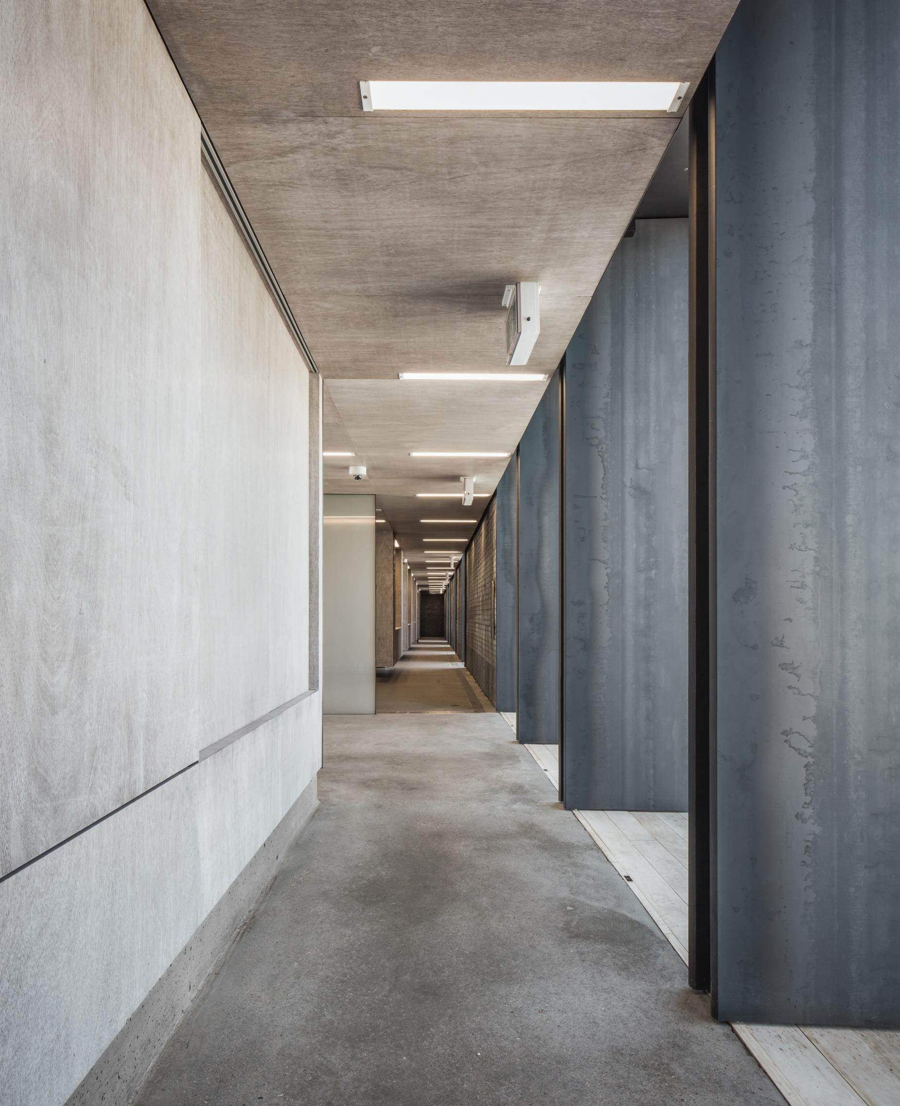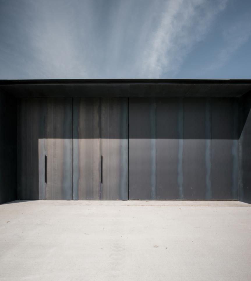 The extruding entry arch culminates in an infinity mirror, creating a single point perspective. Within the thick concrete facade, a puncture is present, giving way to a blackened steel arch. Pocketed glass and steel doors slide within the wall, to welcome guests.