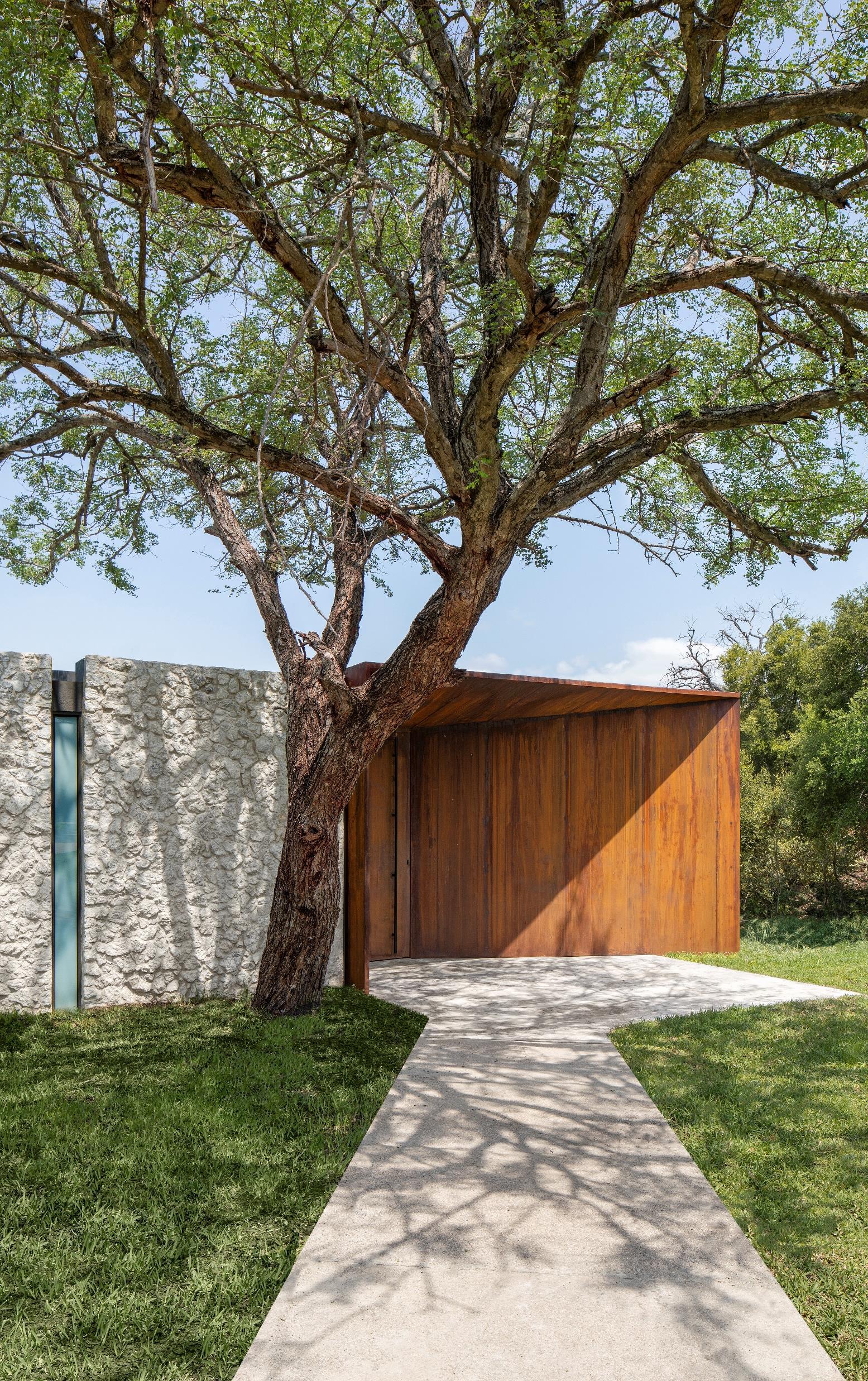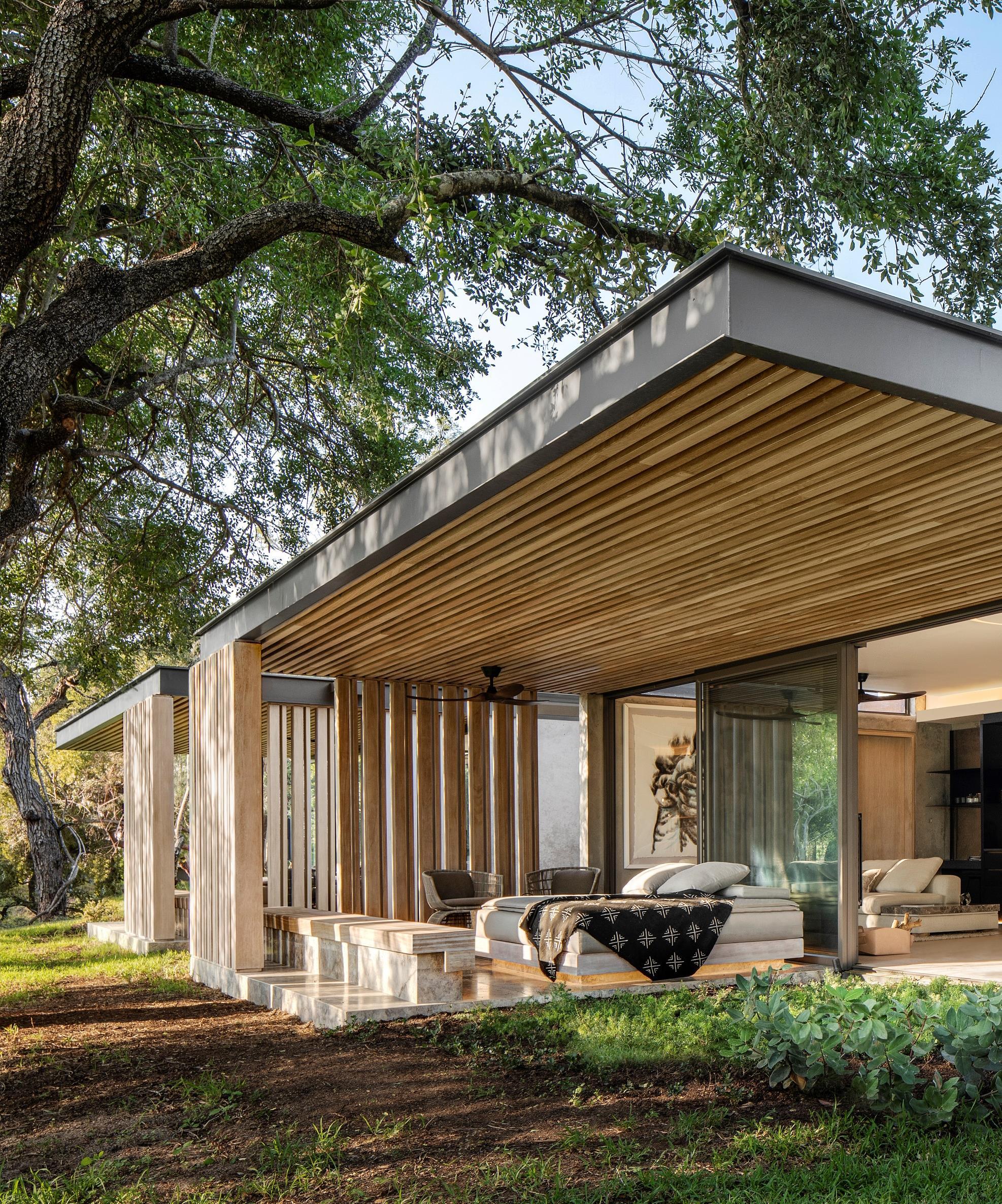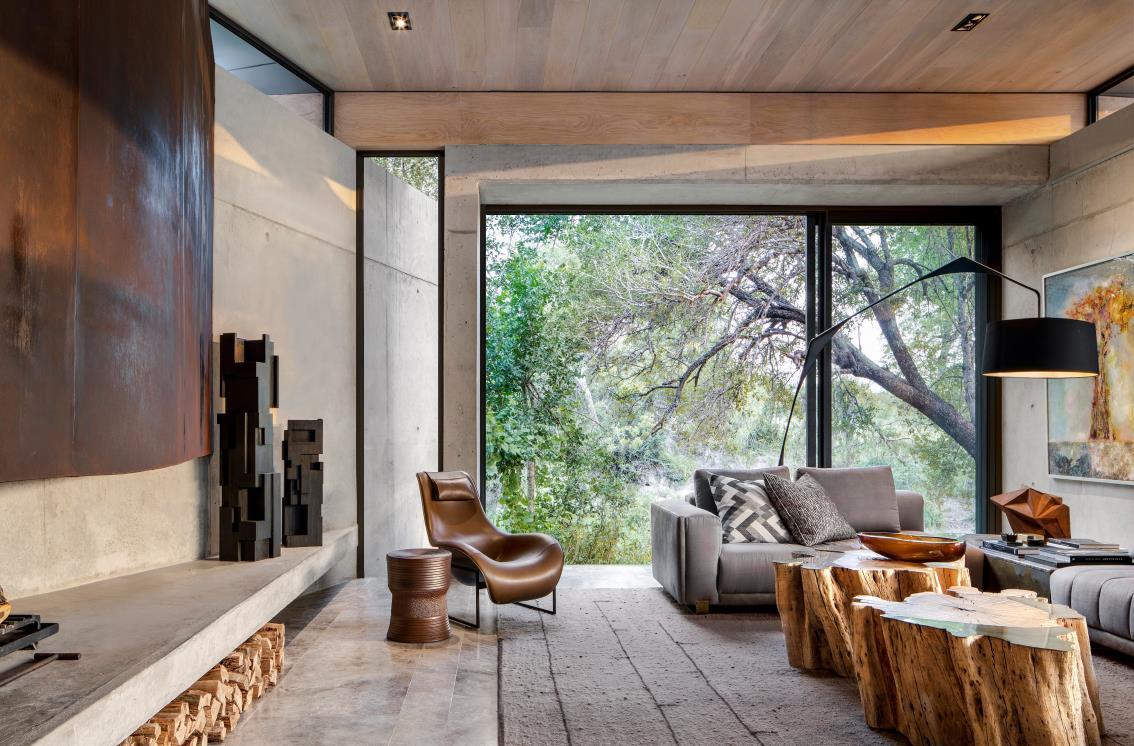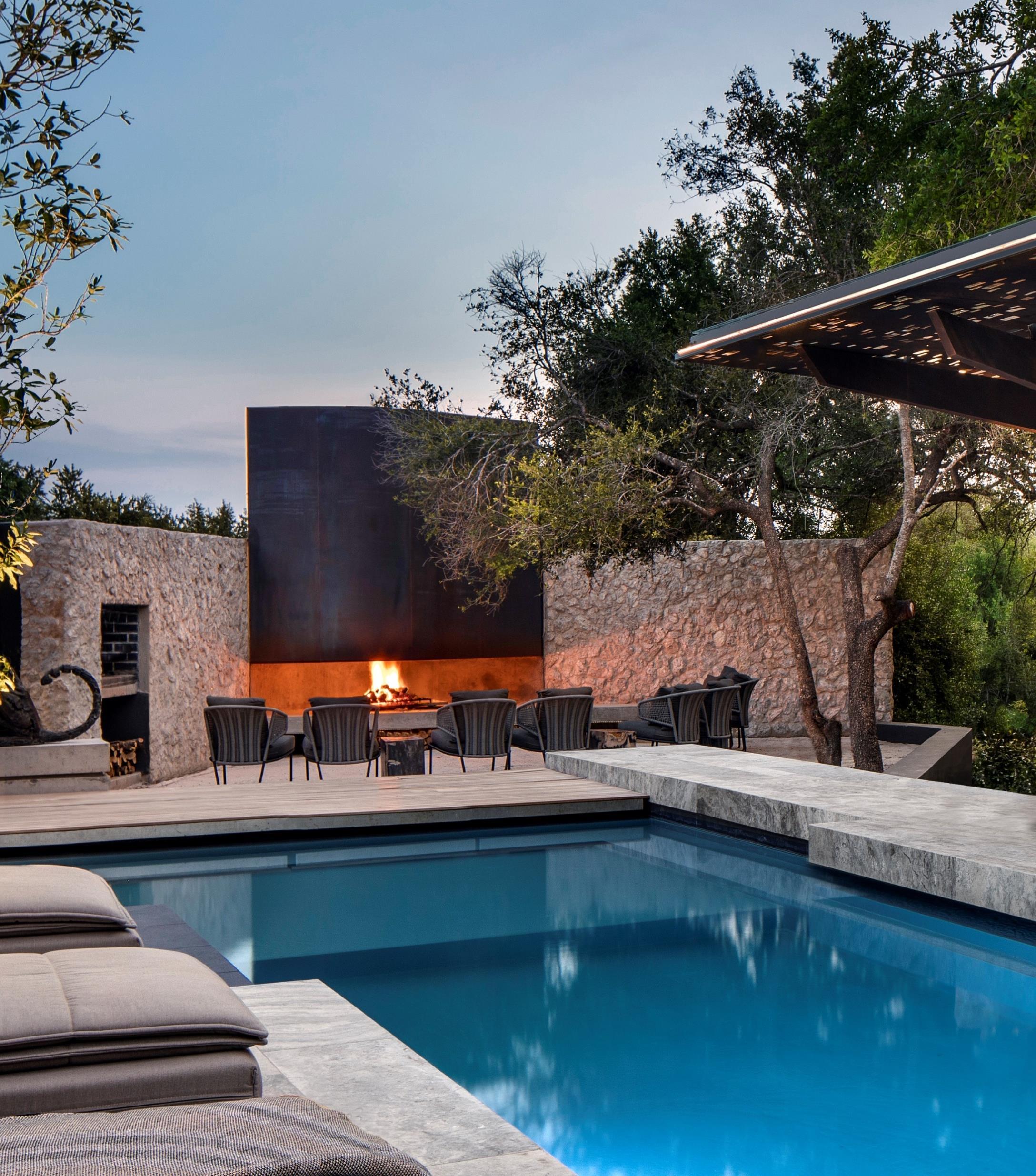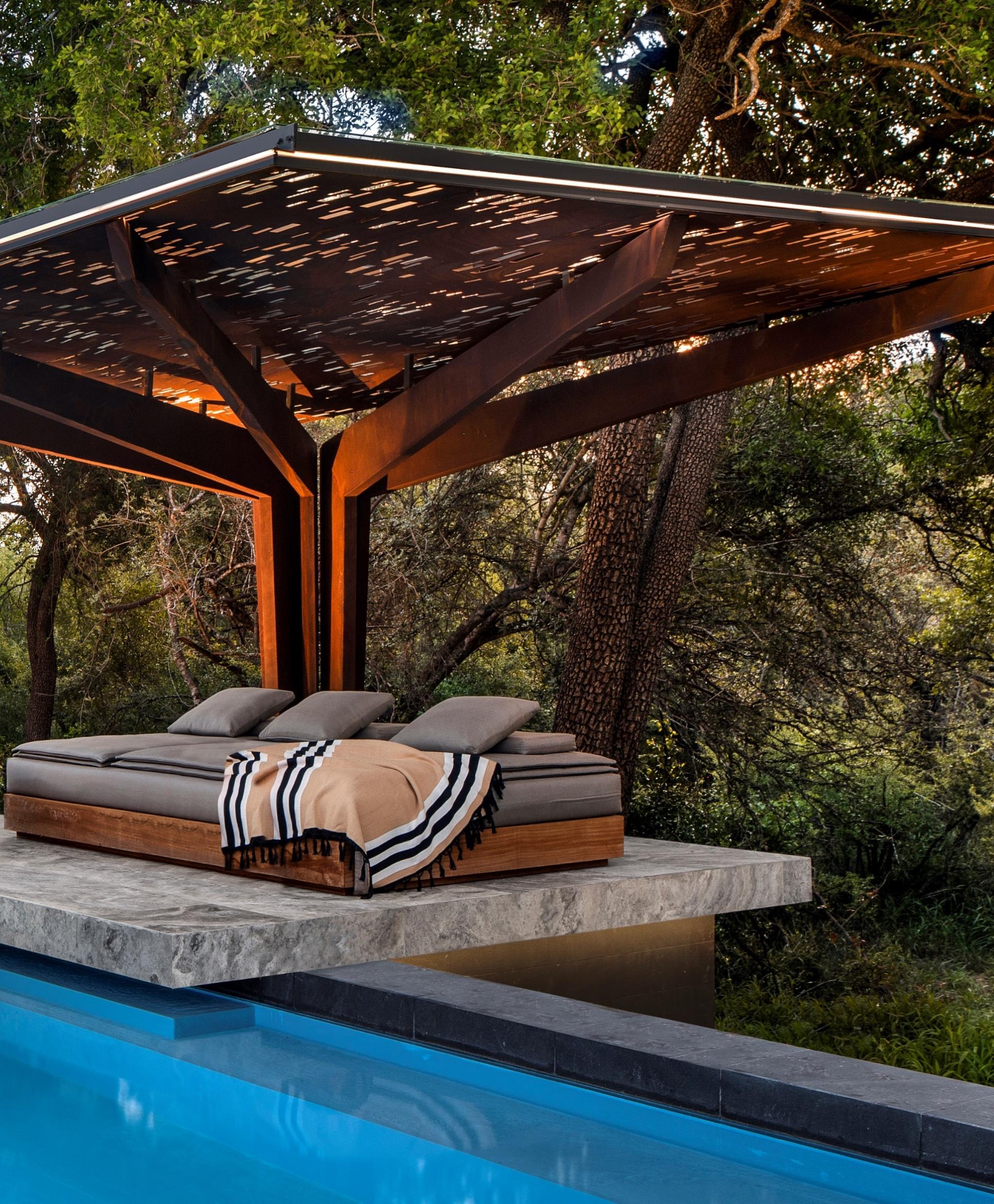 The outdoor features woven into the spaces around each Plains House include a boma area, an expansive terrace, and a heated pool. Sculptural raw rusted steel pool pavilions, inspired by the canopy of the local Tamboti tree, filter dappled light through their cantilevered branches.