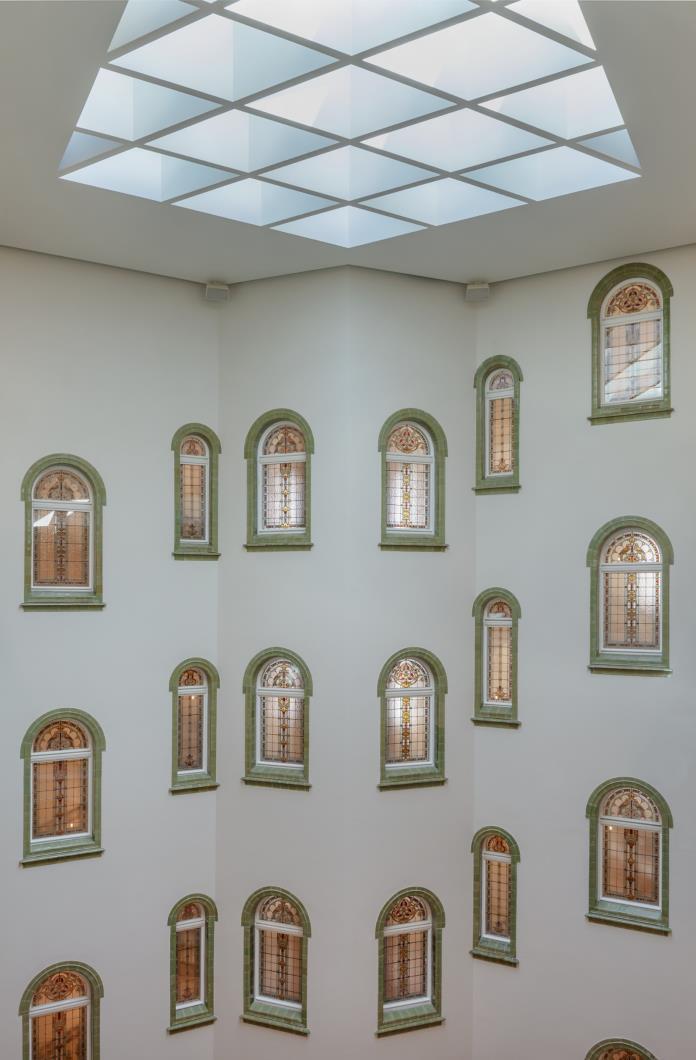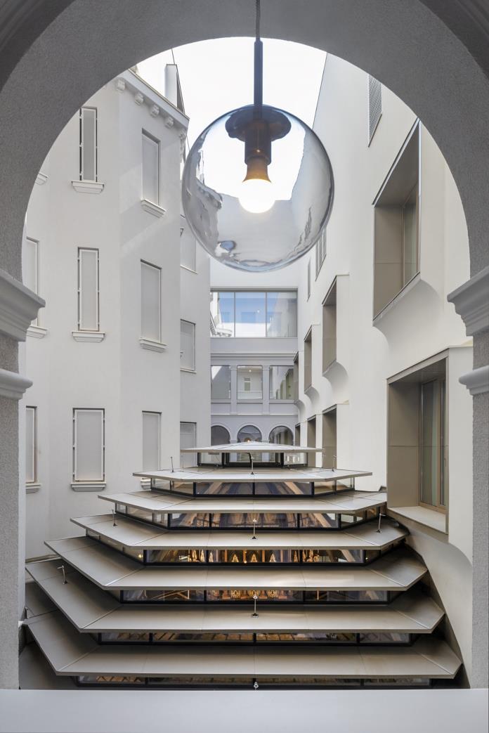 While ARCHIKON worked hard to tactfully restore the arcade to its historical beauty, it was the work above within the residences that allowed the architectural studio to bring modern aspects to the building. A onceopen air courtyard that provided access to the apartments themselves has now been covered with a unique rooftop with geometrical glass panels. This allows light into the renovated space but protects it from the elements. The same area has been restored as an interior space, close attention was paid to maintaining the original features of the building, such as the octagonal column of the building’s previous elevator or the elaborate stained-glass windows that give the newly covered space a sense of fantasy.