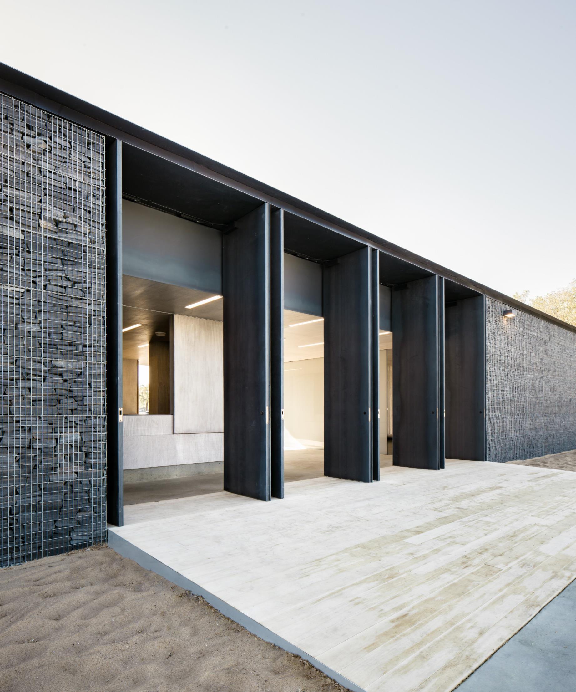 The project’s materiality creates a fundamental conceptual connection between the technical demands of the pool and the design of the built enclosure and landscape elements. The dark limestone and steel of the gabion wall construction defines the enclosure’s vertical dimension as filter-like or breathable, as granular and porous.
