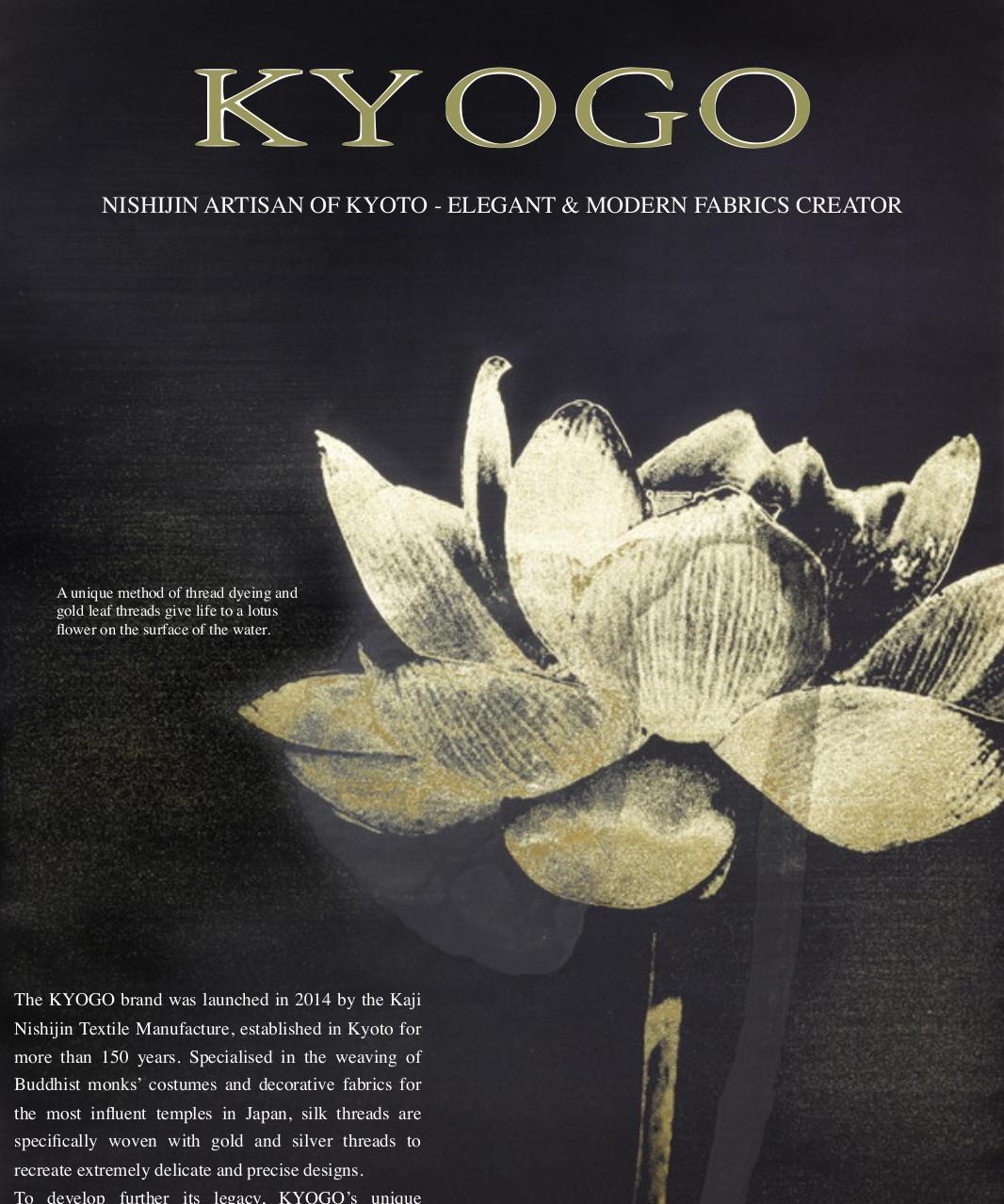 The KYOGO brand was launched in 2017 by the Kaji Nishijin Textile Manufacture, established in Kyoto for more than 150 years. Specialised in the weaving of Buddhist monks’ costumes and decorative fabrics for the most influent temples in Japan, silk threads are specifically woven with gold and silver threads to recreateextremelydelicateandprecisedesigns Todevelopfurtheritslegacy,KYOGO’suniquetechnique was created through the mastery of the ancestral Nishijin Textile technique, resulting in the creation of genuineandinnovativeinteriorfabrics