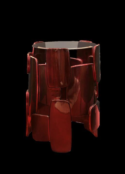 Lunarys side table tells a story about a provocative design shape that was once a pouf, reincarnating now in a side table at any seating and living area, or vice versa. The crafted lacquered legs are combined with a colored hammered glass table top. www.hommes.studio