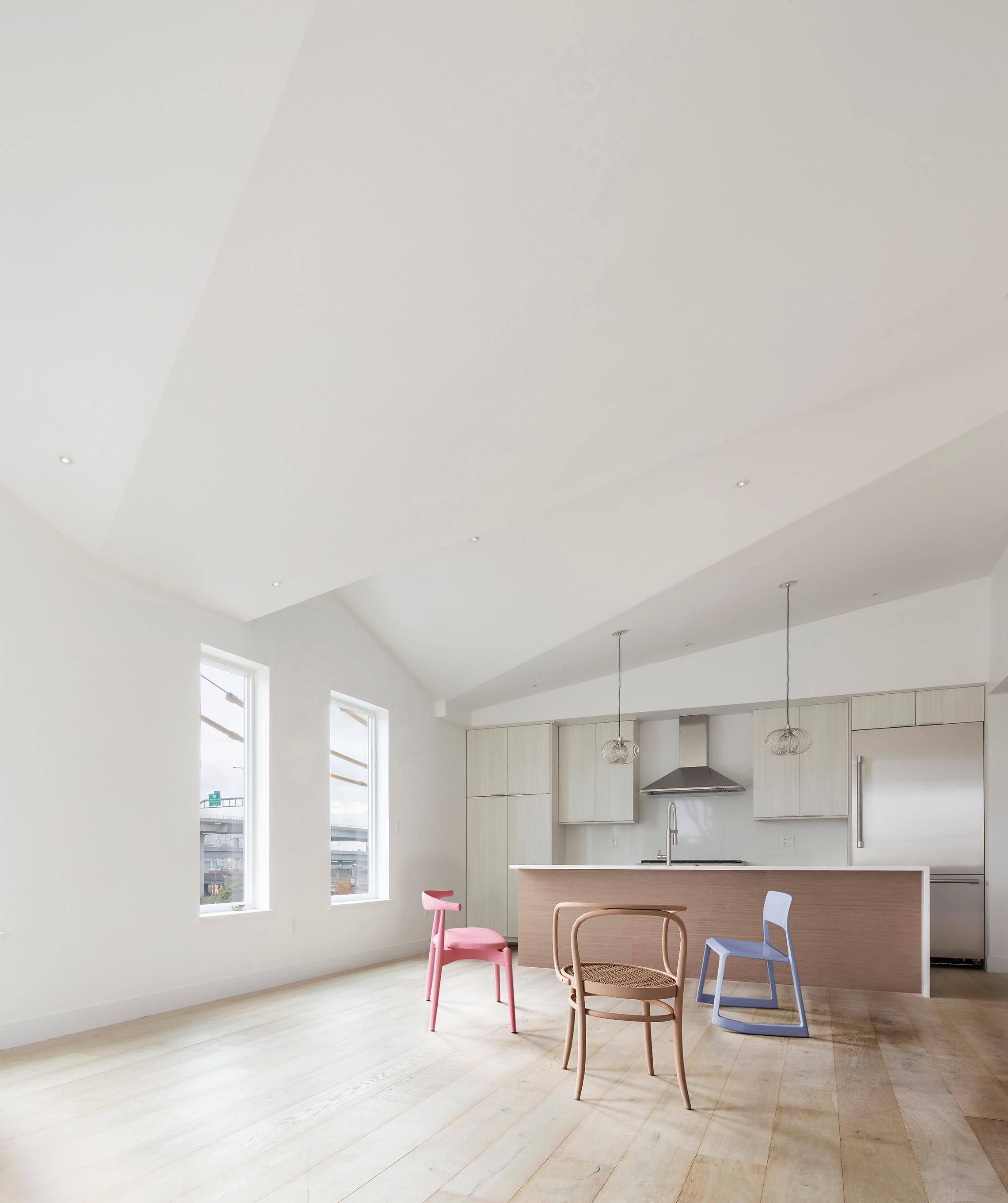 French 2D's design for the renovation and addition to an existing building in Boston takes into account its history and the unique position it holds within its context. The current renovation maintains the side entrance and creates three loft-style flats, entered from the short side of the building, while maintaining the ghosts of previous entrances along the building's original frontage. The third floor is given a saw-toothed mohawk, with its profile facing the elevated highway and roads beyond, while the short side of the building maintains a straight-faced integration among its more traditional neighbors. www.french2d.com
